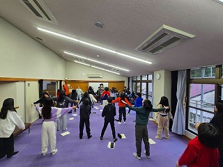 - 林間学習だより④林間学習の2日目がスタートしました。朝起きたら雨が降っていたので、室内での活動です。  <朝の集い>  <ラジオ体操>  <キーホルダー作り>