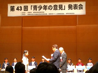 10月25日(土)に文化パルク城陽で第43回「青少年の意見」発表会が実施されました。城陽市内の小学校・中学校・高校・特別支援学校のそれぞれの代表児童、生徒が意見発表をしました。青谷小学校からも6年生が口頭発表を5年生が誌上発表をしました。