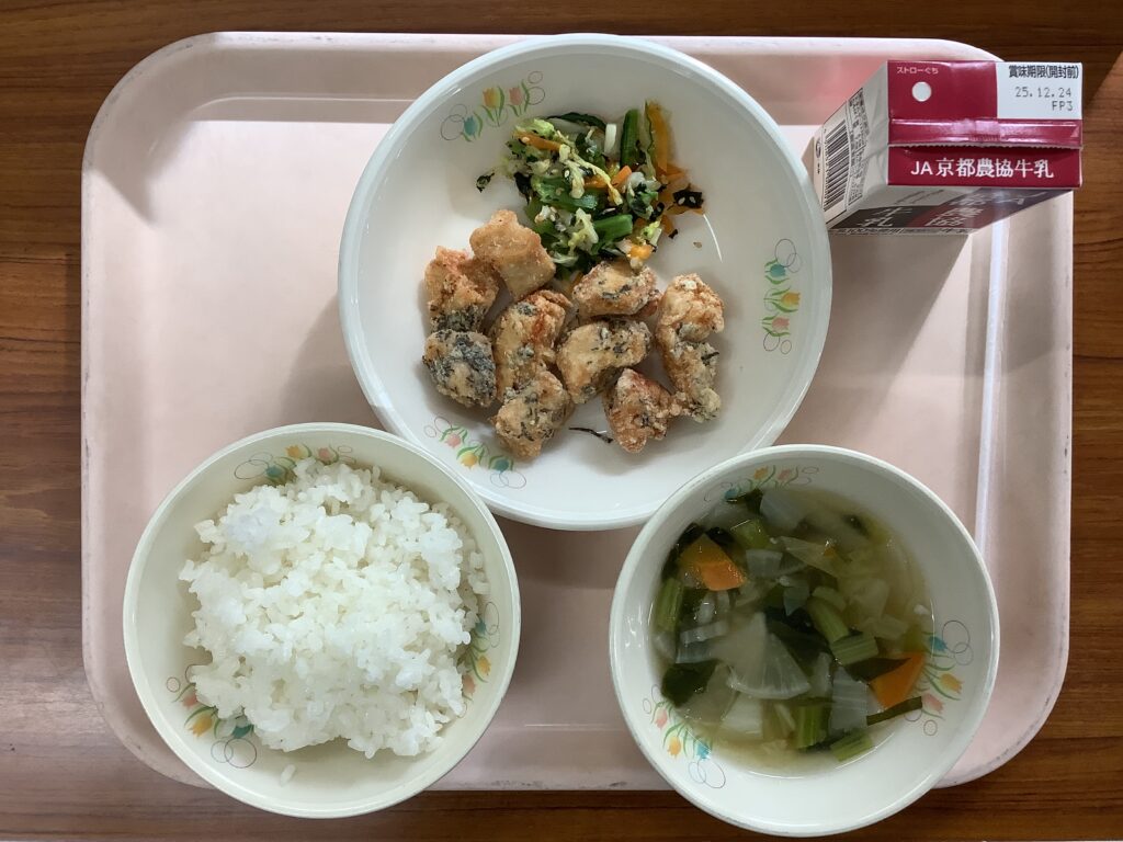 今回の食材は「茶」です。綾部小学校では、「あやべ茶のからあげ」を提供しました。子ども達が大好きなからあげ。地域の食材を味わいながら給食時間を過ごしていました。