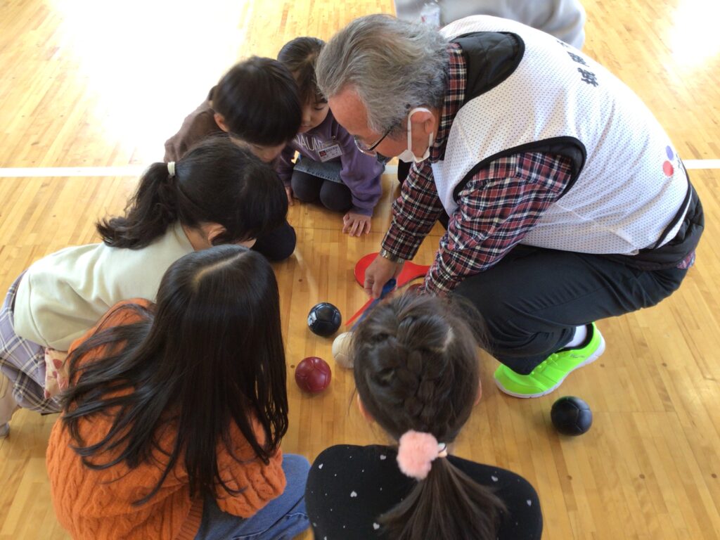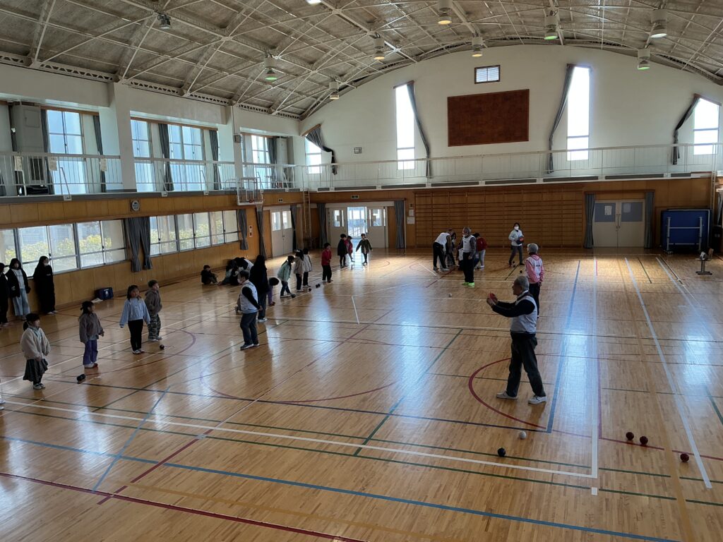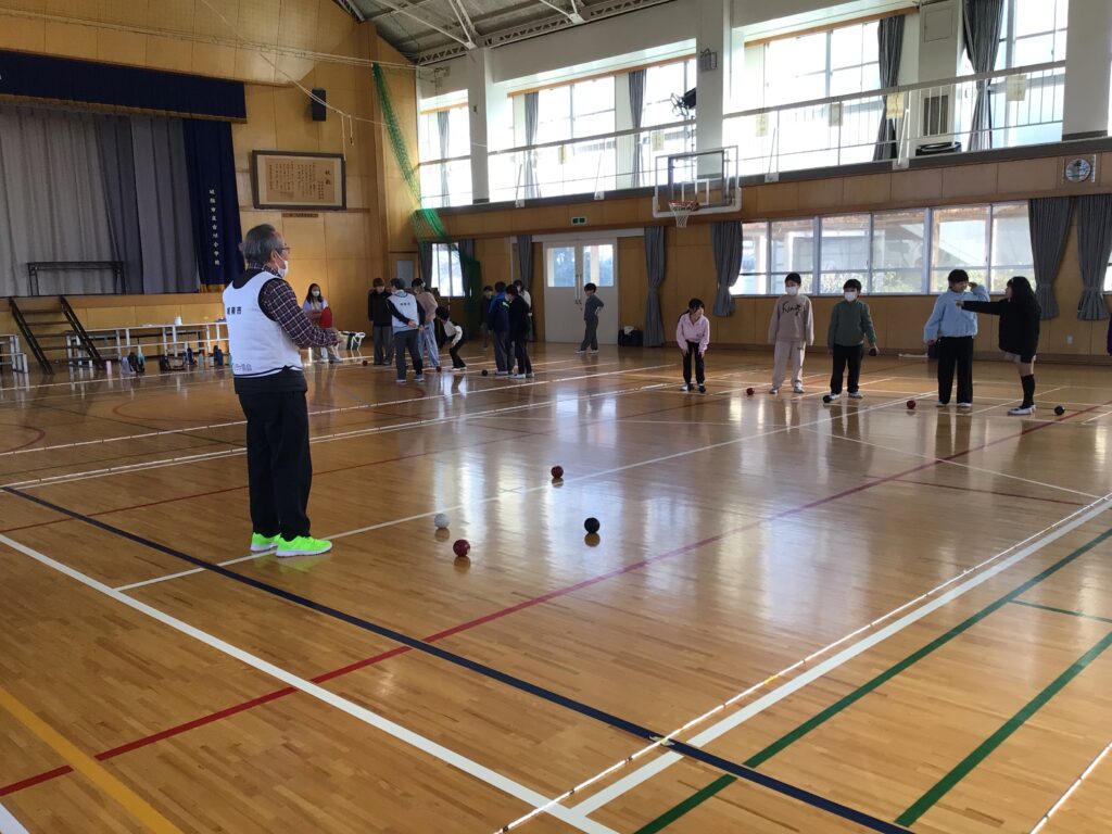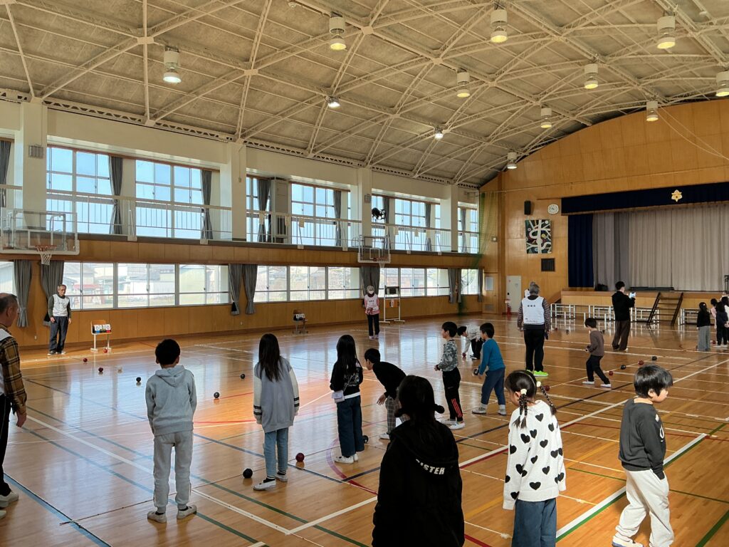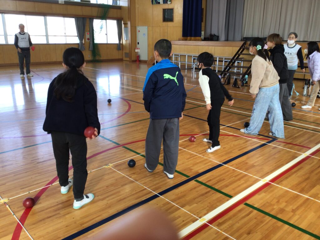 当日は、赤チームと青チームに分かれ、協会の方々からルールや投げ方のコツを教えていただきながら、実際にゲームを体験しました。子どもたちは、狙いを定めて真剣にボールを投げたり、仲間と作戦を立てたりしながら、楽しそうに取り組んでいました。ジャックボールの近くにぴたりと止まると、大きな歓声が上がる場面も見られました。
