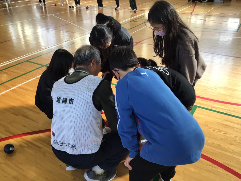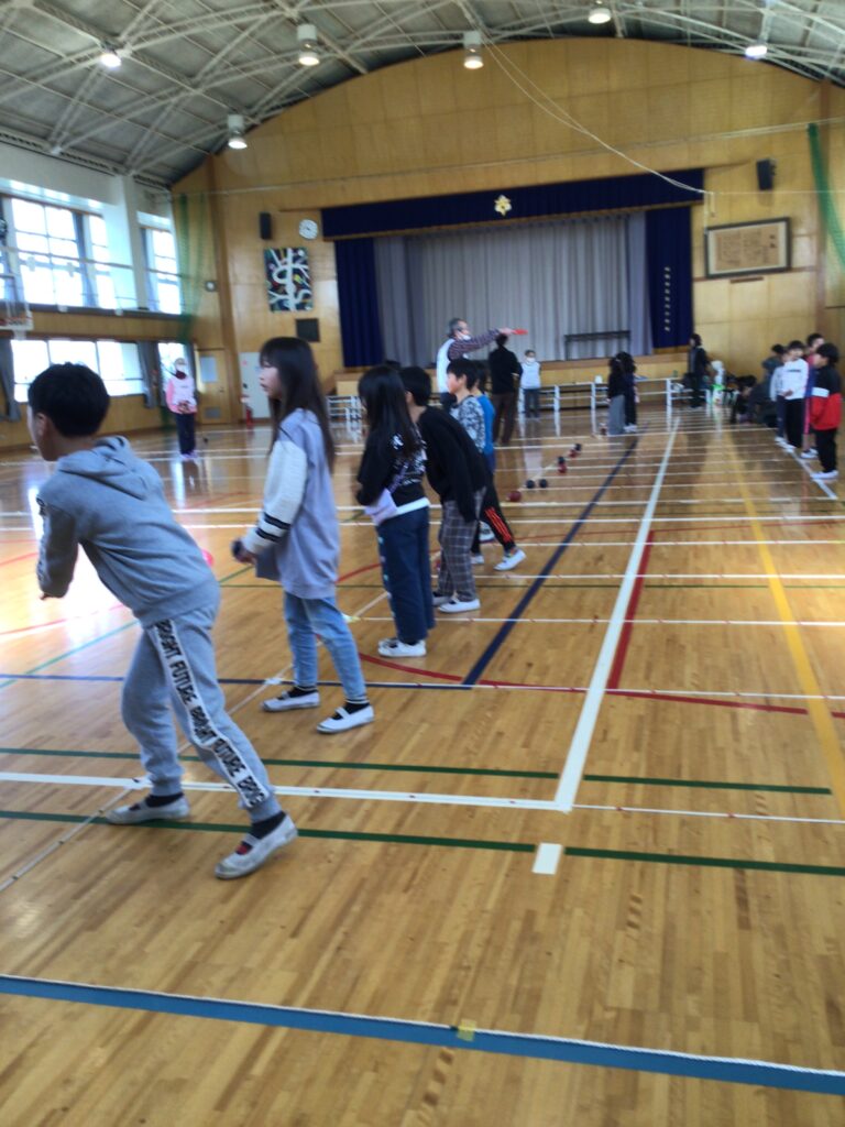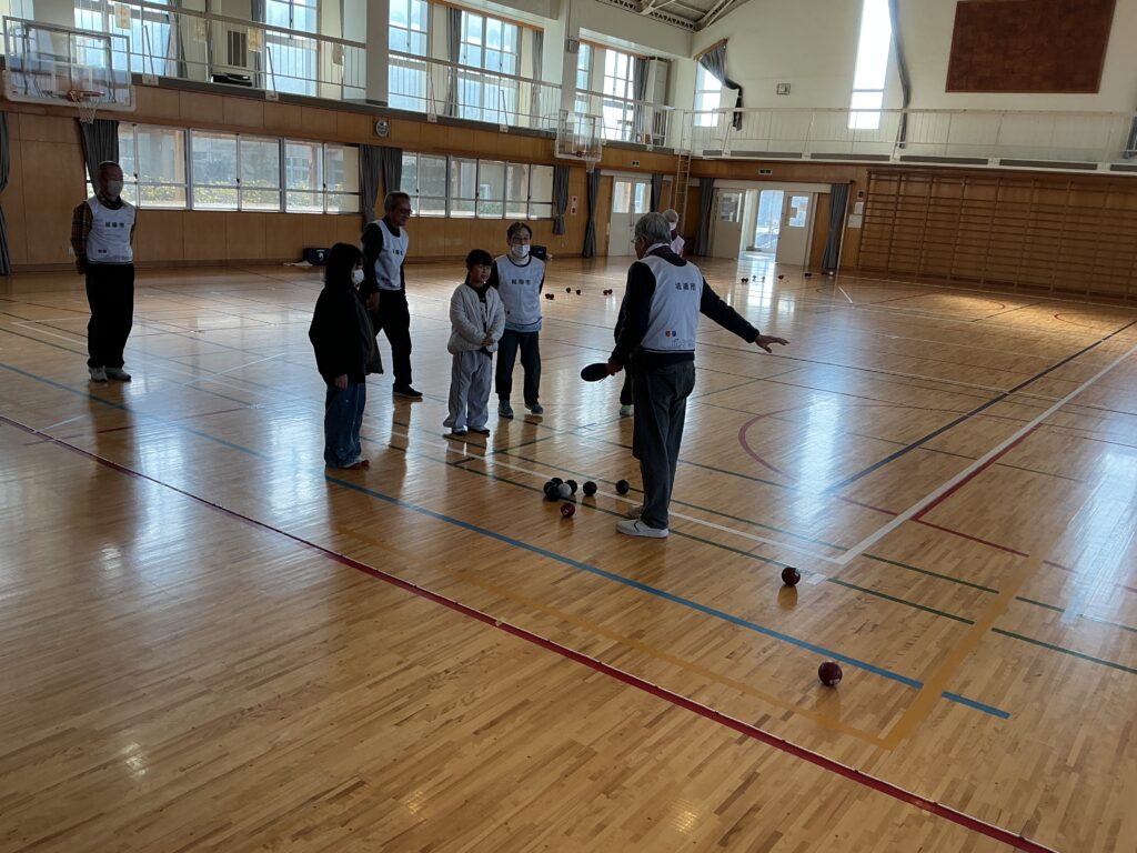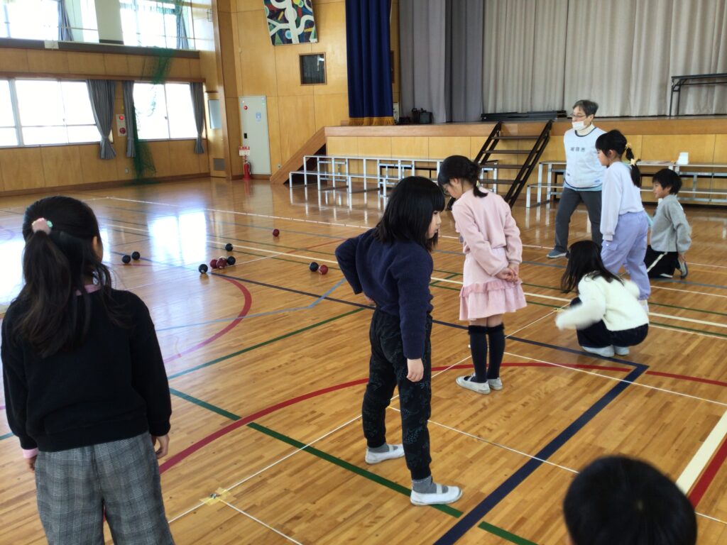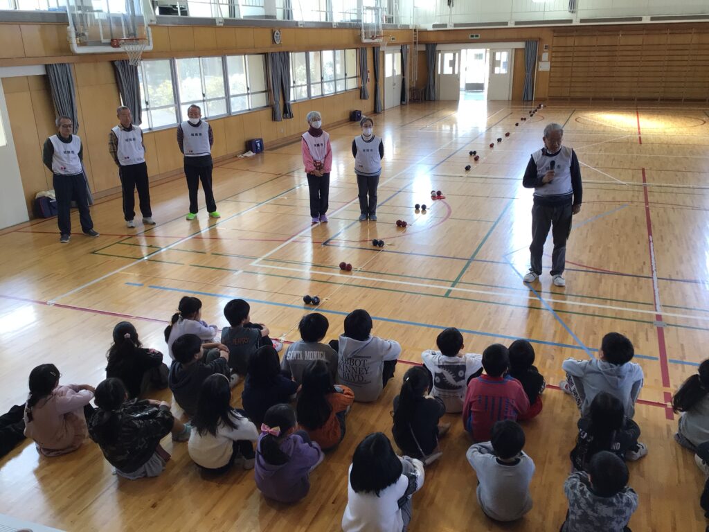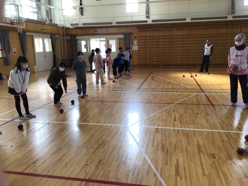 当日は、赤チームと青チームに分かれ、協会の方々からルールや投げ方のコツを教えていただきながら、実際にゲームを体験しました。子どもたちは、狙いを定めて真剣にボールを投げたり、仲間と作戦を立てたりしながら、楽しそうに取り組んでいました。ジャックボールの近くにぴたりと止まると、大きな歓声が上がる場面も見られました。