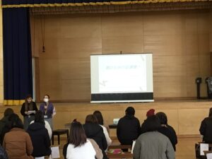 説明の最後には、今池小学校PTAの方から「親のための応援塾」と題して、今池小学校のことについてスライドを使いながら教えていただきました。