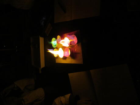 内容は、炎色反応の実験とルミノール反応の実験、さらにルミノール反応の実験を元に警察の鑑識官になったつもりで、血液のしみこんだハンカチを探し出すというものでした。最後に、ウミホタルの発光現象の実験も行いました。