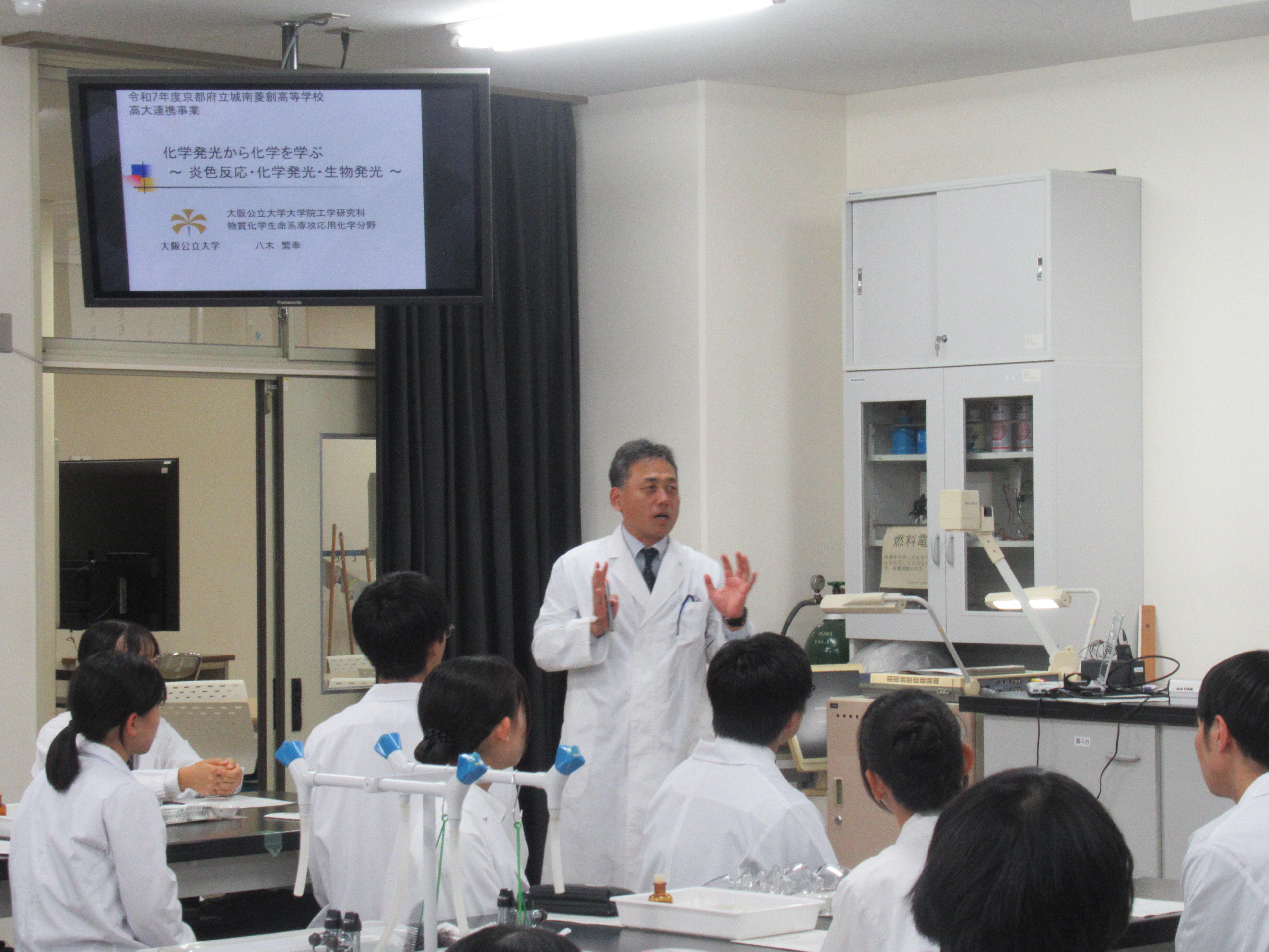 教養科学科2年次生の取組として、10月28日(火)、大阪公立大学の八木繁幸教授を講師にお迎えして、「化学発光から化学を学ぶ」という授業を実施しました。