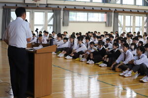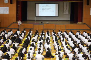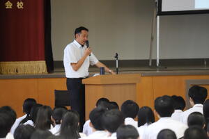 橋根校長の式辞では、数字の3に因み、学力定着における復習の重要性を「記憶の3」、起床・就寝・学習開始時刻を固定する重要性を「生活習慣の3」と紹介し、長い夏季休業を充実させるよう生徒に呼びかけました。