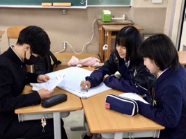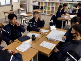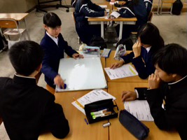 文化祭で発表した総合的な学習の時間の取組や普段の授業で、課題を解決するために日々、話し合い、意見を聞き、そしてまとめるといったことを繰り返す中で、トモニ学び合う力がついてきていますね。今日の写真は、今月の月目標を検討している様子です。