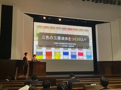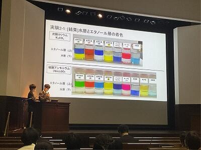 12月25日(木)に大阪大学豊中キャンパスで開催された日本化学会近畿支部の高等学校・中学校化学発表会にて「三色の三層液体をつくりたい!」というタイトルで発表しました。