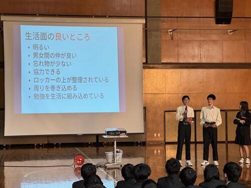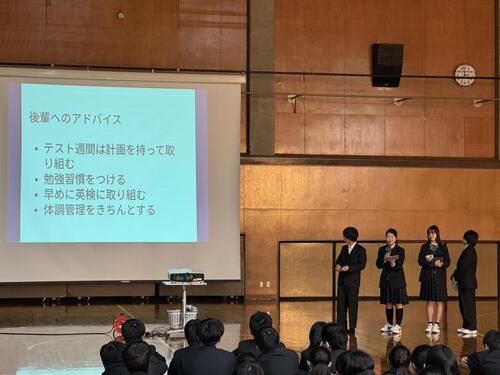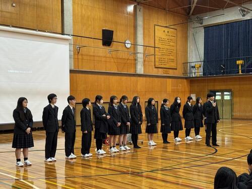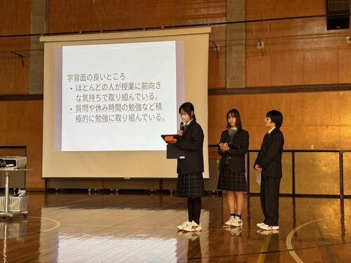 また、生徒総会の後には、中学校ミーティング(中学校集会)を行いました。表彰を行ったり、各クラスの代表委員が2学期のクラスの振り返りを発表してくれました。