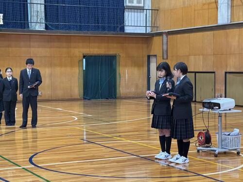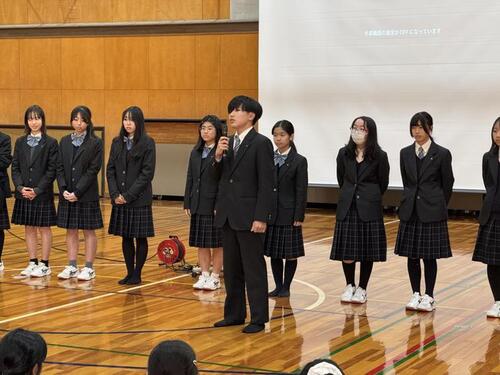 前年度の「第6期生徒会本部委員」による活動報告などが行われた後、前生徒会長の挨拶がありました。