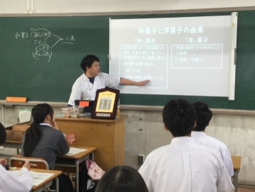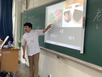 今年度も2年生家庭基礎の授業できょうと食いく先生・大槻喜宏先生(大槻菓舗・与謝野町)をお招きし、「和菓子を学ぼう」の講義が始まりました。10月10日(金)には2年4組、10月14日(火)には2年1組の生徒が、和菓子の歴史、種類、四季折々の和菓子などについて学びました。