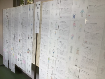 生徒達が考えた研修旅行の服装は、100号館から200号館に向かう2階渡り廊下に展示中です。