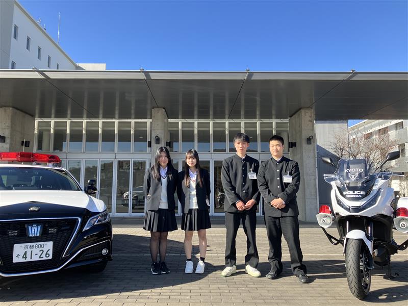 1年「はばたき」(総合的な探究の時間)で、京都府警察本部主催のCHA-Leaders AWARD Kyoto 2025「調査・研究・アイデア提案部門」に挑戦した1年生4名が、発表会に参加しました。全13グループのうち、5グループが一次審査を通過することができ、京都府警察学校での二次審査(発表)に挑みました。結果は残念ながら参加賞となりましたが、挑戦したことで新たな気づきや目標を見つけることができたようです。