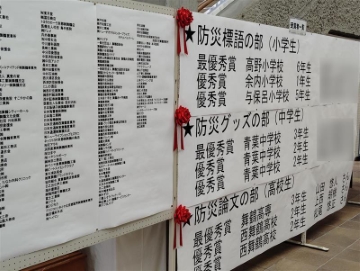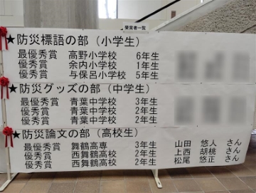 舞鶴市総合文化会館で、舞鶴防災協会設立記念「防災講演会」が行われました。これに先立ち、高校生は防災論文に応募し、本校からは2年生上西さん、3年生松尾さんがそれぞれ優秀賞に選ばれました。当日は、防災標語の部(小学生)、防災グッズの部(中学生)、防災論文の部(高校生)、それぞれの最優秀賞受賞者が表彰されました。