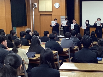 1月17日(土)18日(日)に大学入学共通テストを受ける生徒へ向けて、「最終ガイダンス」兼「激励会」を行いました。副校長先生や3年学年団の先生たちから激励の言葉をいただき、進路指導部長からはテスト当日の注意点や受験後の活動について説明を受けました。多くの生徒が緊張した様子で会場へ集まりましたが、終了後には「頑張ろう」と互いに励まし合いながら帰路につく姿が印象的でした。当日は生徒たちが元気に受験会場へ行き、全力を出してこられるよう、教職員全員が応援しています。