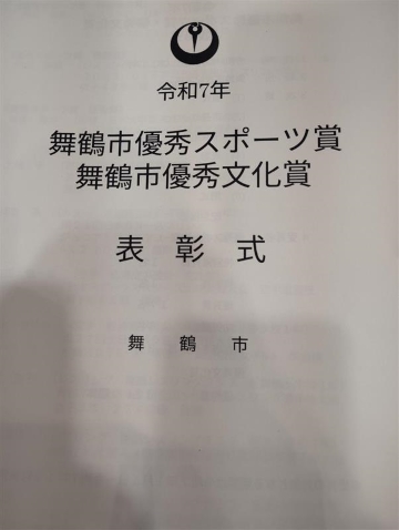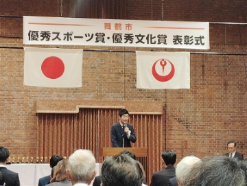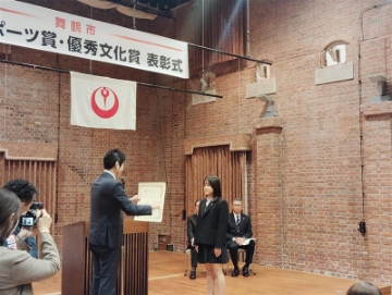 優秀文化賞個人では上林さん1名のみで、鴨田市長から賞状とトロフィーを受け取りました。表彰式は優秀スポーツ賞と合わせて行われ、世界や全国で活躍する舞鶴の若者たちが集まりました。また、指導者として活躍された方への功労賞も授与され、小学生から大人まで今後の舞鶴のスポーツ文化振興を担っていく方々の会となりました。