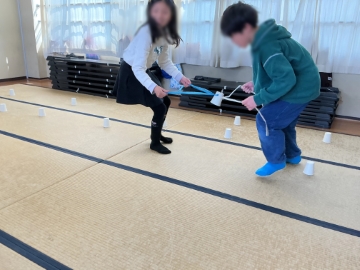 ![]() 生徒が手作りした道具を使って紙コップリレーに挑戦 |