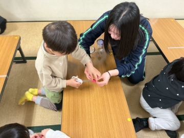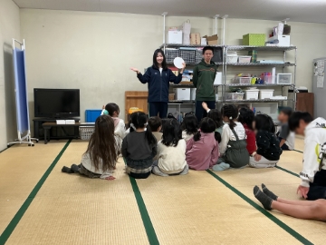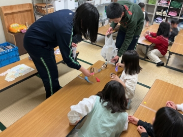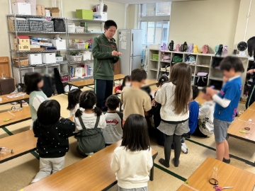 ![]() 「ペットボトル空気砲」を作る材料を配ります |