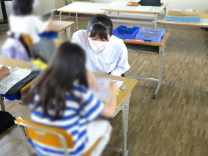 毎年夏休みに、明倫小学校の児童への学習支援ボランティアを行っています。今年度は21名の生徒が参加予定です。初回の24日(月)は11名が参加しました。事前に教材研究を行い、しっかり準備をして臨みました。明倫小学校の児童や先生方からいただいた感謝の言葉を励みに、有意義な活動ができたと思います。将来教師を目指す生徒も多く、今回のボランティアを通して、教師になりたいという思いが一層強くなったようです。24日(月)から28日(金)まで毎日10名程度の生徒が活動します。