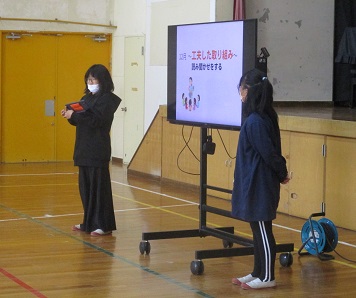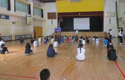 全体会では、「こげよマイケル」の英語の歌とフリートークを行いました。歌では、大きな声でどうどうと歌い、参加者を驚かせていました。また、フリートークではステージから降りて、参加者に英語で話しかけに行きました。子どもたちは、その後、振り返りをしましたが「知らない多くの先生方と話せて嬉しかったです。」「また、来年もこんな発表をしたいです。」「英語の得意な先生が多かったけど、自分も英語で話せてよかったです。」「先生方の英語が聞き取れないこともあったけど、これから聞き取れるように頑張りたいです。」など、前向きな感想が多く聞かれました。3年間の外国語の研究は一区切りを迎えましたが、今後も子どもたちを育て、伸ばし、中学校につなげ、府内にも更に研究の成果を広げていきたいと思っています。