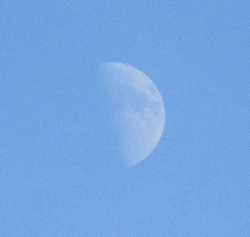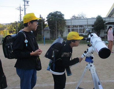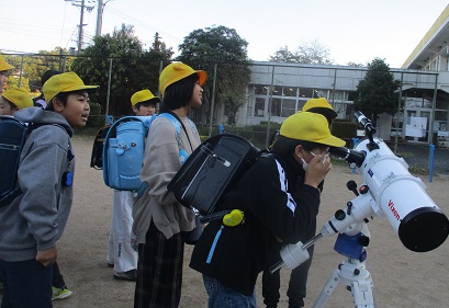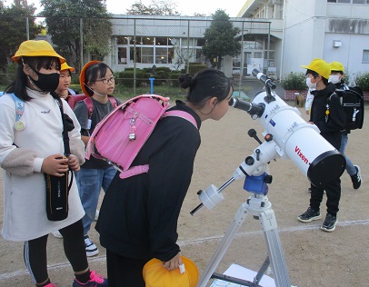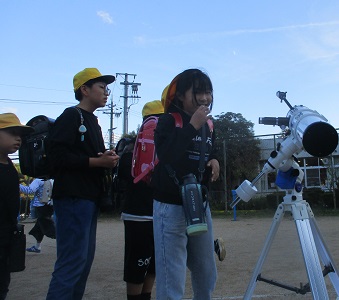 - 月の観察空が澄み渡り半月が出ていたので、反射望遠鏡を使って下校前に天体観測をしました。子どもたちは「見えた。大きい。」「クレーターも見えた。」「海みたいなとこも見えた。」と興奮していました。秋の夜長、ご家族で星空を見られるといいですね。