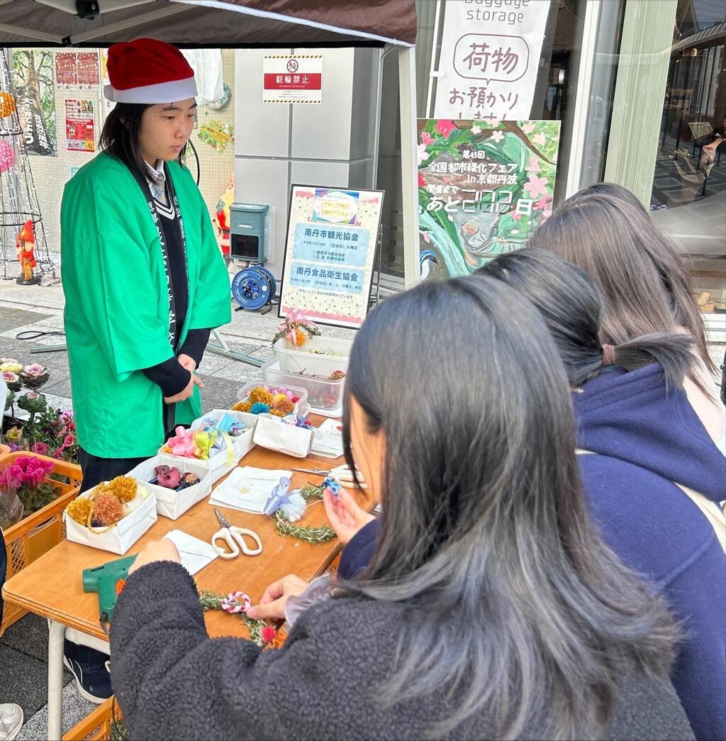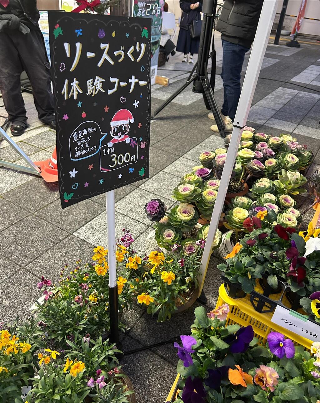 12月20日にJR園部駅前で開催されたクリスマスフェスタに参加しました。 天気も良い中で、シクラメンなどの花や野菜を販売しました。 学校で栽培した花を飾る「リース作り体験コーナー」では、好みの花飾りをつけた素敵なリースができあがりました。ご来場いただいた皆様、ありがとうございました。