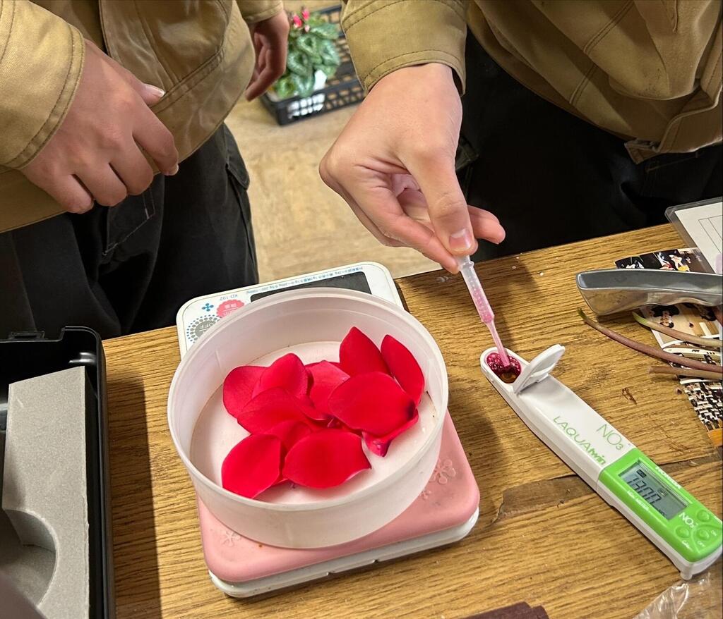 2年草花コース「栽培と環境」の授業で、シクラメンの硝酸態窒素濃度の調査をしました。 植物体に含まれる硝酸態窒素の濃度を測定することで、肥料管理の目安とする土壌診断方法です。 シクラメンの花や葉から汁液を採取し、専用の測定器で濃度を測ります。 植物の栽培に適した肥料や土壌について学びますが、実際に栽培している植物が適切に環境管理ができているか客観的な数値で知る体験的な学習でした。