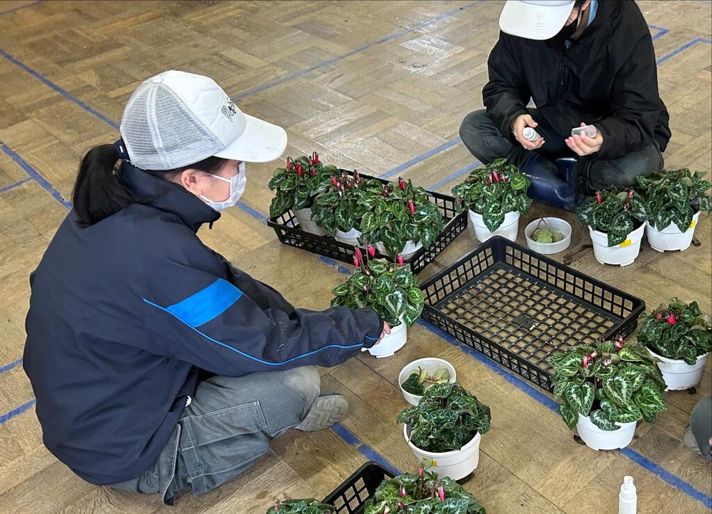 暑さが和らいできたことで、シクラメンがすくすくと成長しています。 花が咲き出しましたが、株を大きくするため花を摘んでいきます。 これから草花コースはシクラメンとビオラの栽培管理で、忙しくなりますが、きれいなお花を届けるためにがんばります!!