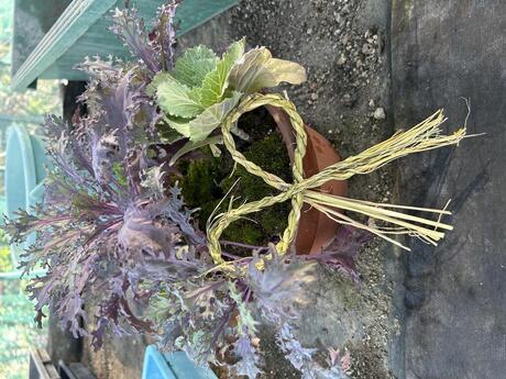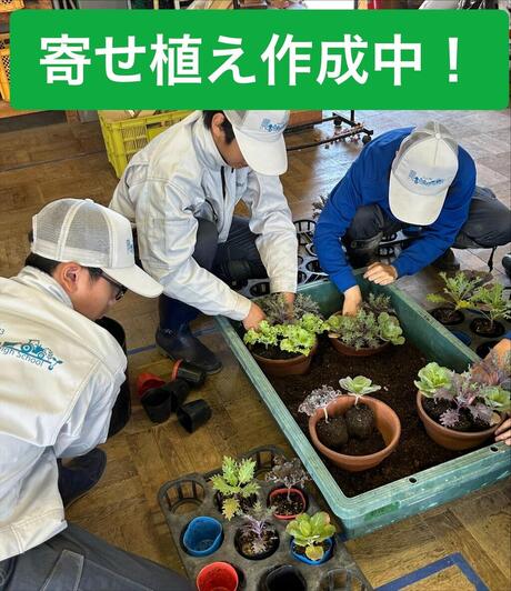 コースの初実習で「寄せ植え」を作りました。 栽培していたハボタンを使ったドーム型の寄せ植えは、初めての1年生には難易度の高い実習でしたが、 園芸技術科の生徒として、植物を美しく見せる技術の習得の一歩です。この寄せ植えは土の表面を苔で覆い、作物コースが収穫した稲の藁で編んだ飾りをつけたお正月仕立てにします。 農芸祭で販売を予定していますので、ぜひ見に来てください。