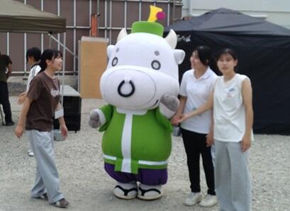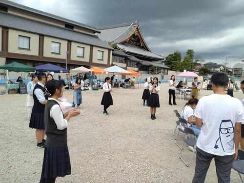 9月20日(土)北野商店街のエンゼルハウス跡地広場で「上京!子のまち大作戦」が開催されました。このイベントに1、2年生の4名がボランティアスタッフとして参加しました。また、合唱部8名も出演者としてステージパフォーマンスを披露しました。会場には地元の子ども支援団体の出店ブースやキッチンカー、消防署からやってきた地震体験車などが並び、来場した親子連れや小学生達がイベントを楽しんでいました。ボランティアスタッフの生徒達は朝の会場設営から参加し、テント立て、ステージ組立て、音響設備の設置などイベント作りの舞台裏を経験しました。そしてハイライトは上京区のゆるキャラ「かみぎゅう君」の着ぐるみにも入るという得がたい経験をさせてもらいました。またこのイベントには同志社大学のボランティアサークルのメンバーも参加しており年齢の近さもあってすぐに打ち解け一緒に運営に取り組みました。その中で大学生活のことや入試のことなど貴重な情報を得ていたようです。イベント終盤に出演した合唱部は用意した3曲を披露したあと、アンコールまでいただき会場を大きく盛り上げました。