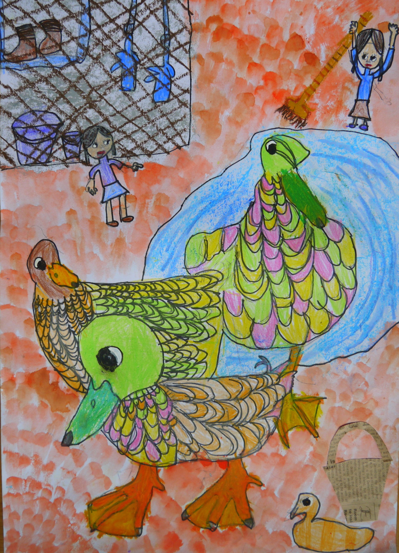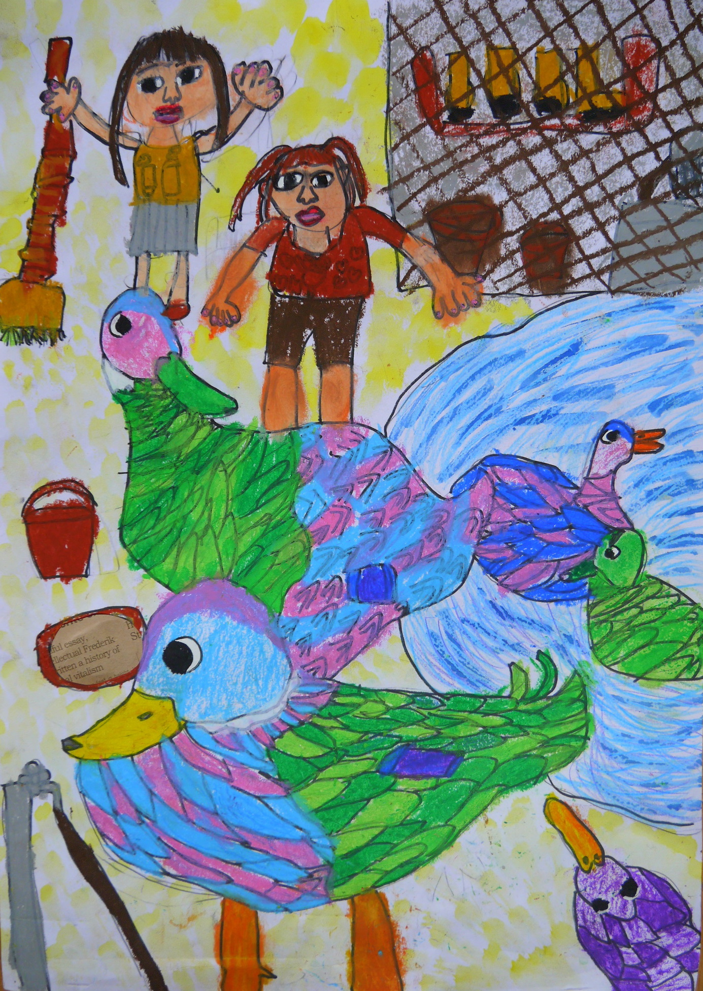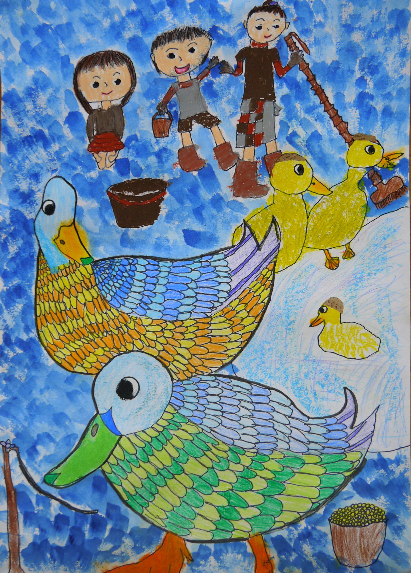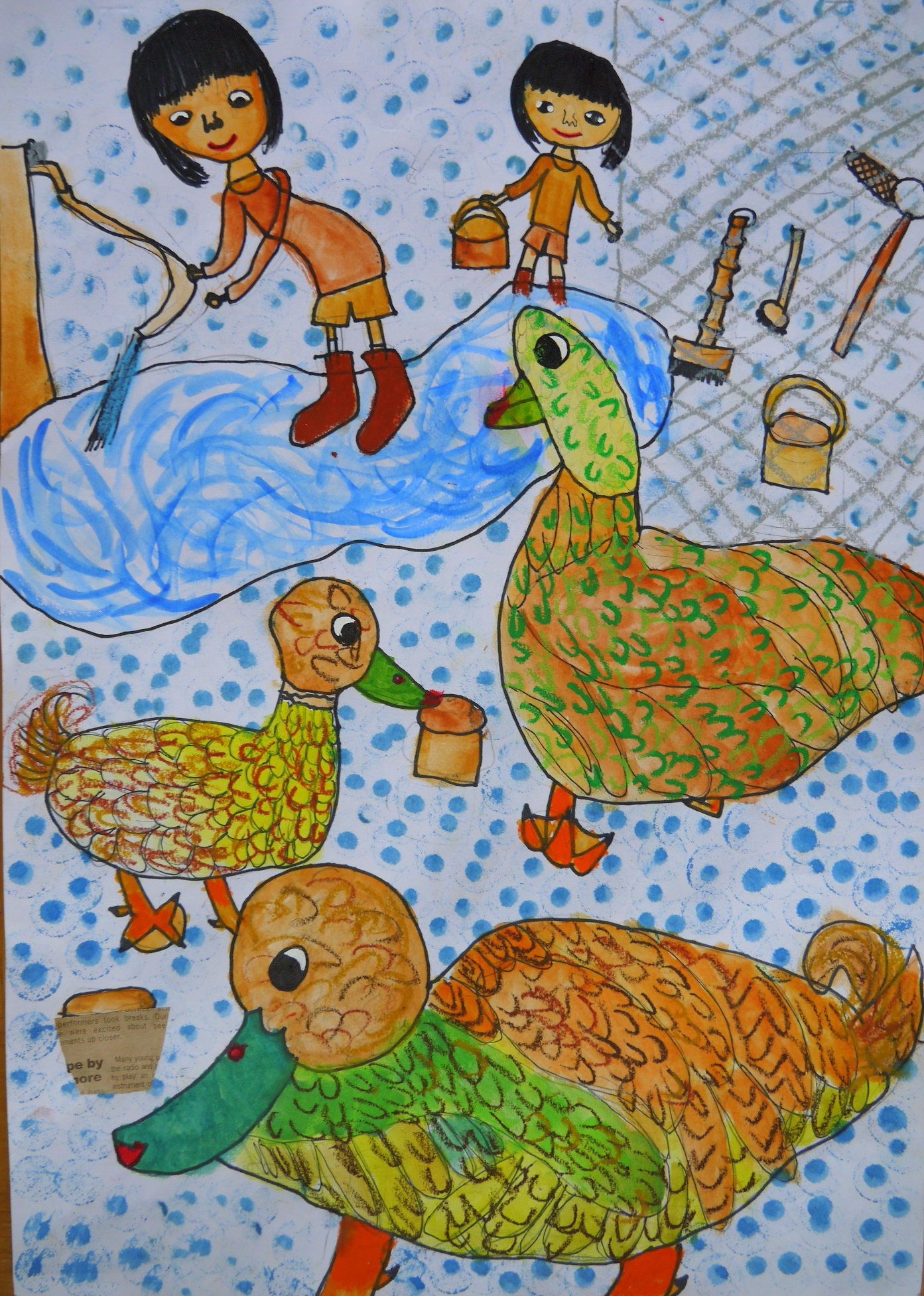 ということで、2・3年生が身近なあいがもの絵を描きました。