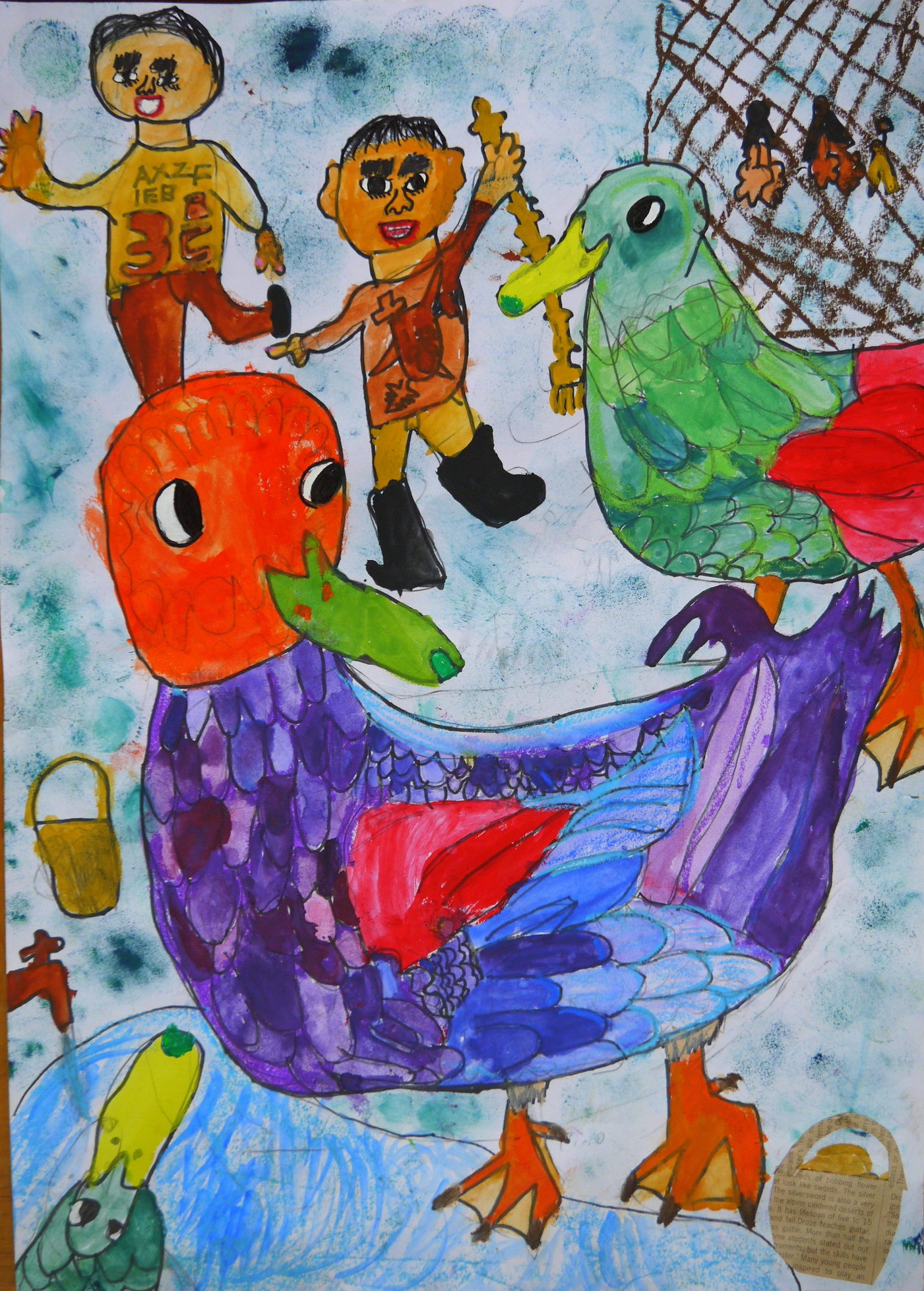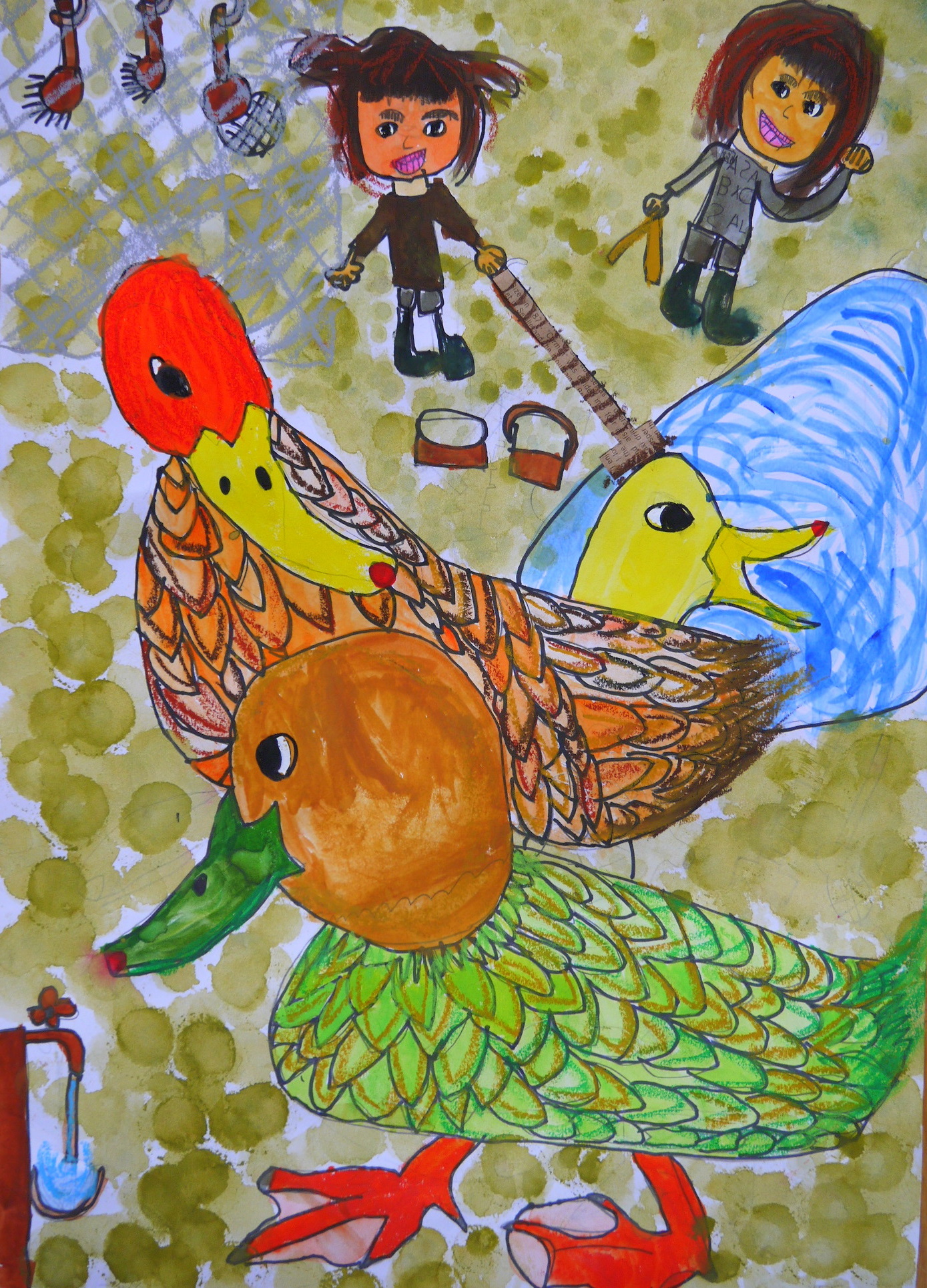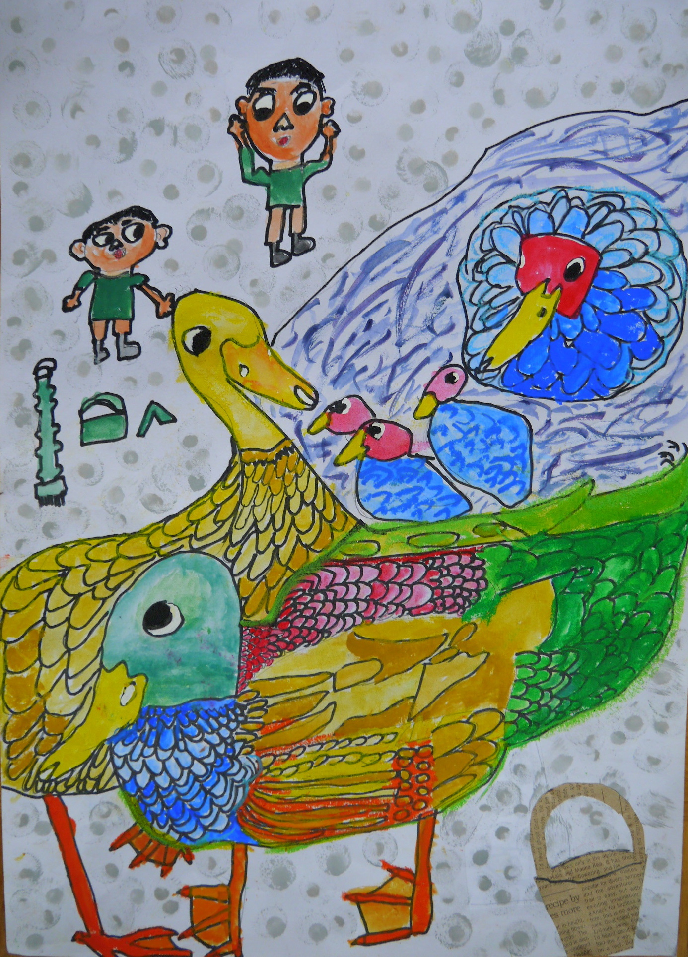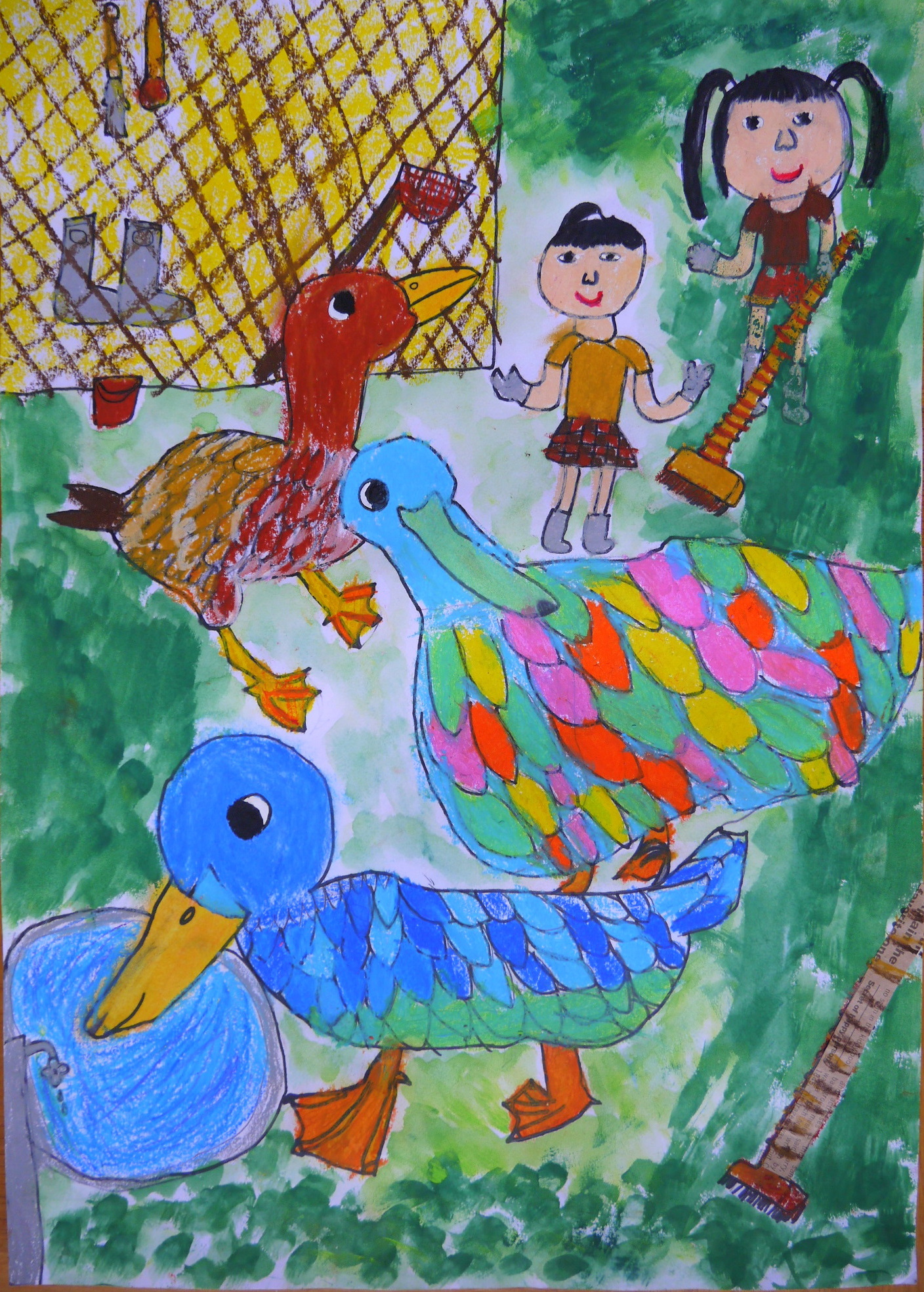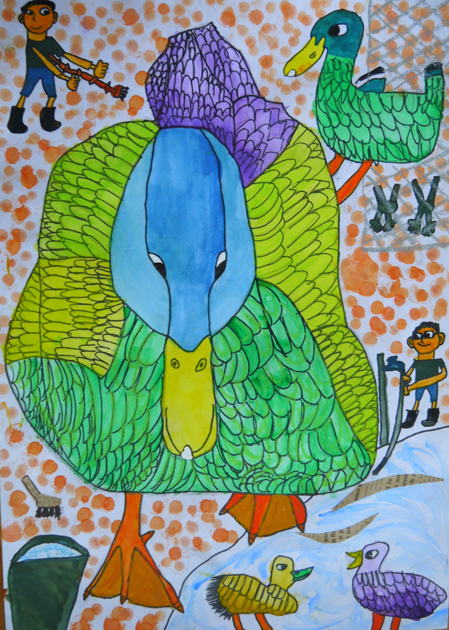 ということで、2・3年生が身近なあいがもの絵を描きました。
