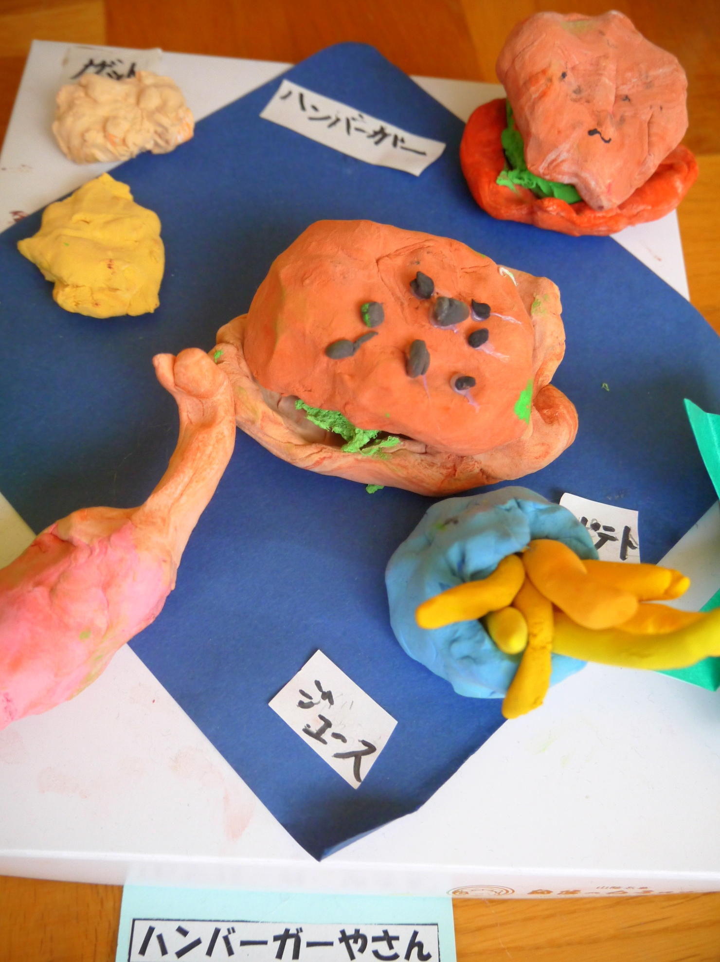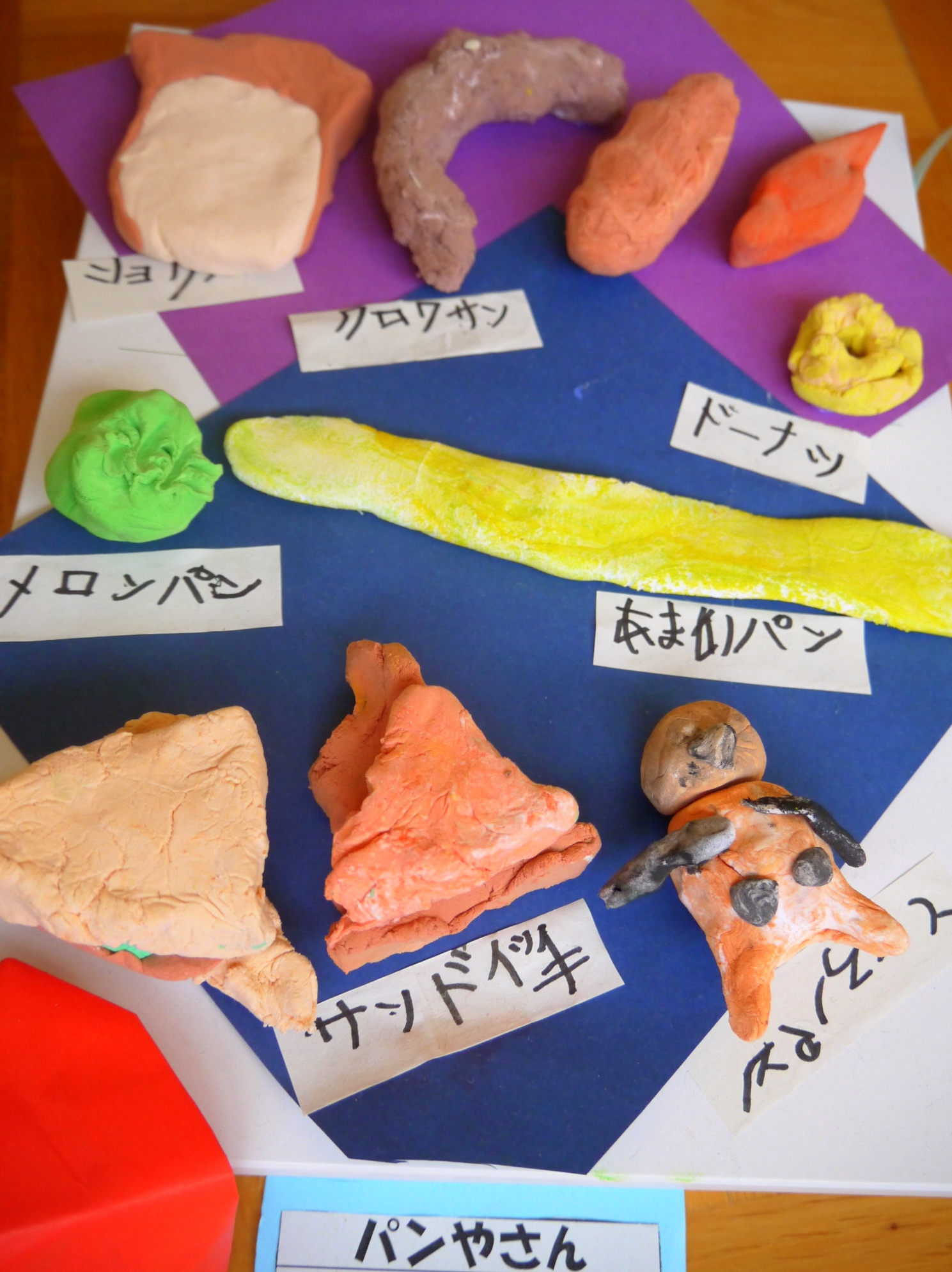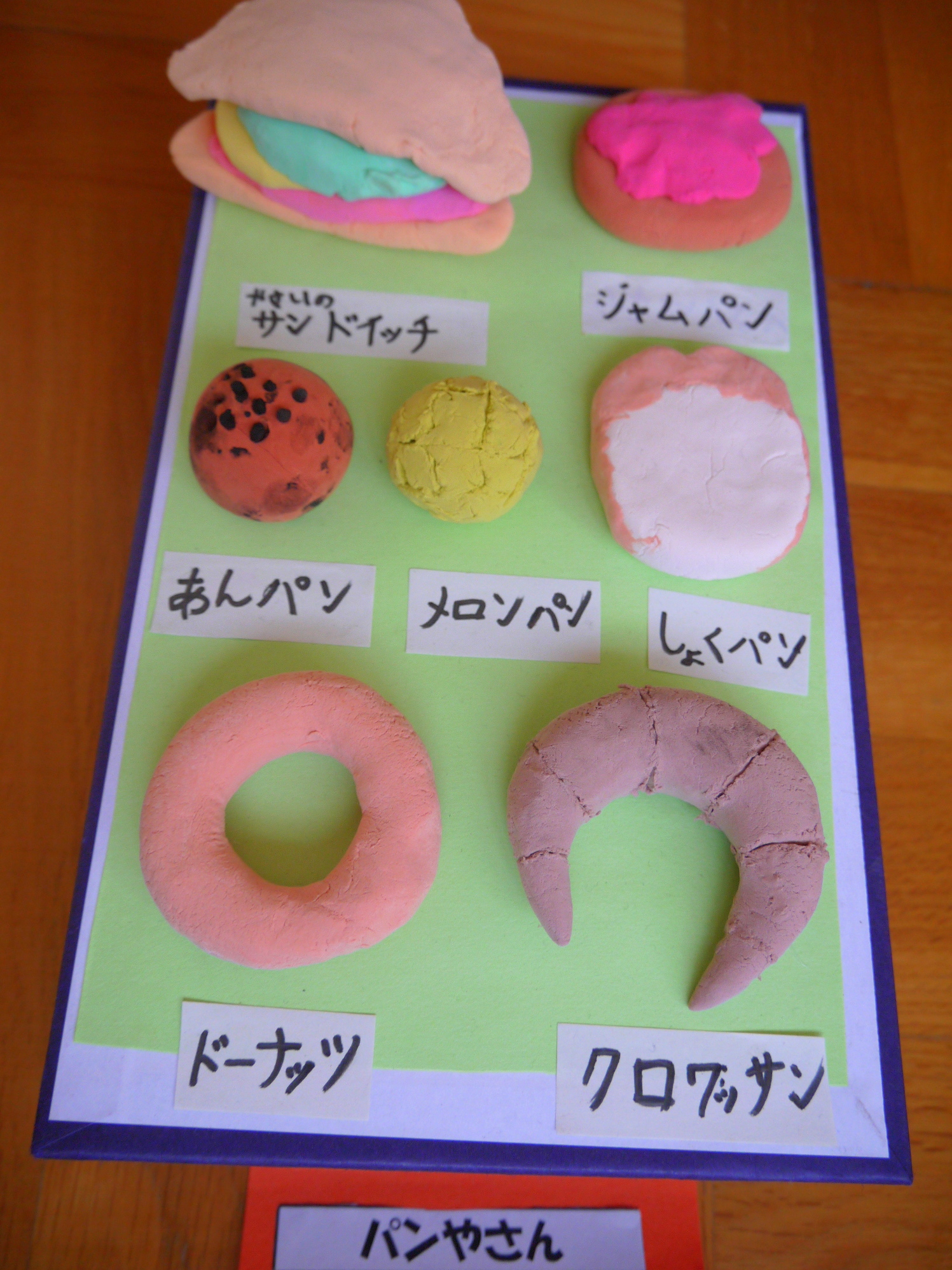 自分たちがお店屋さんになったつもりで、紙粘土で商品を作りました。