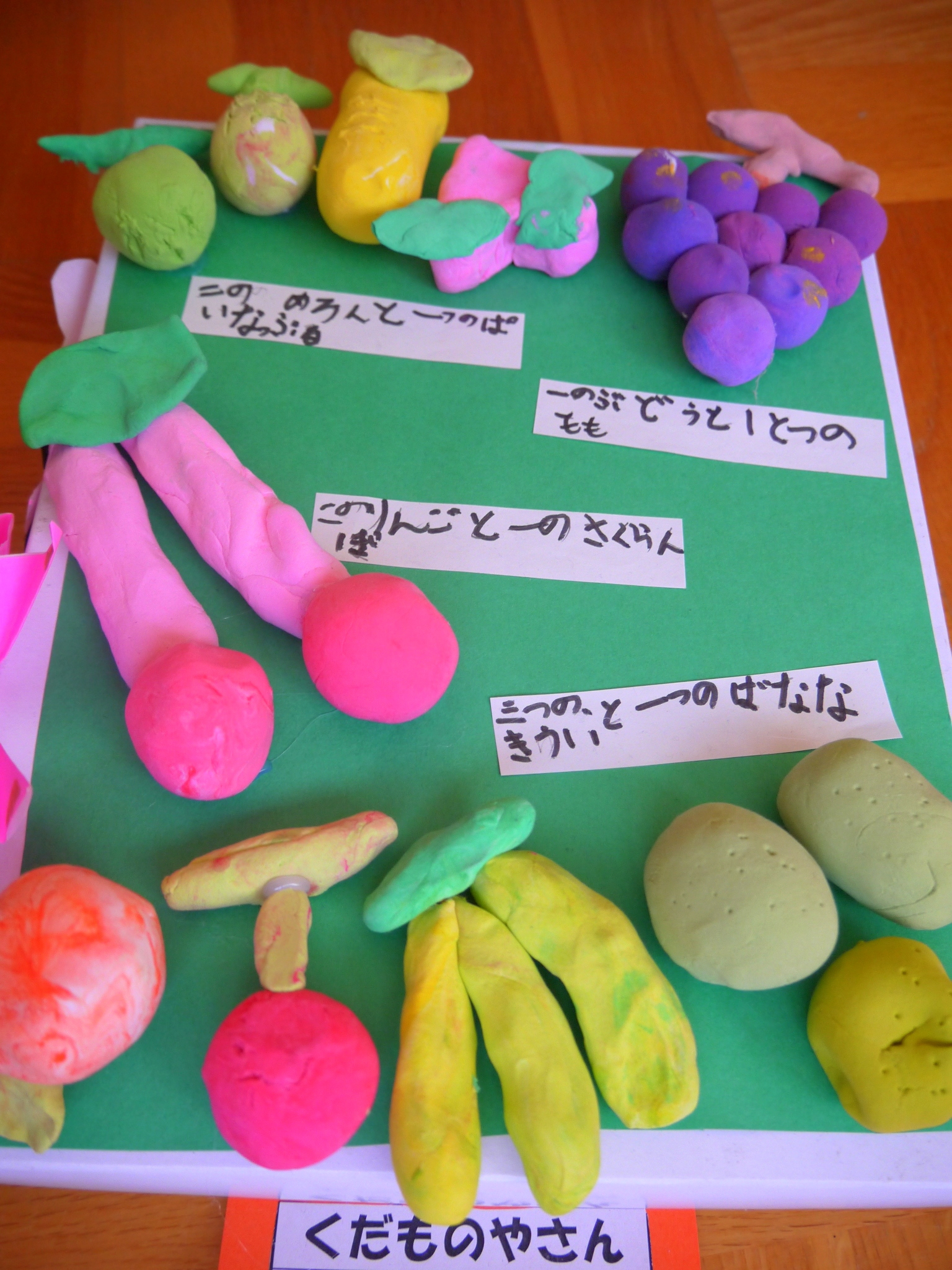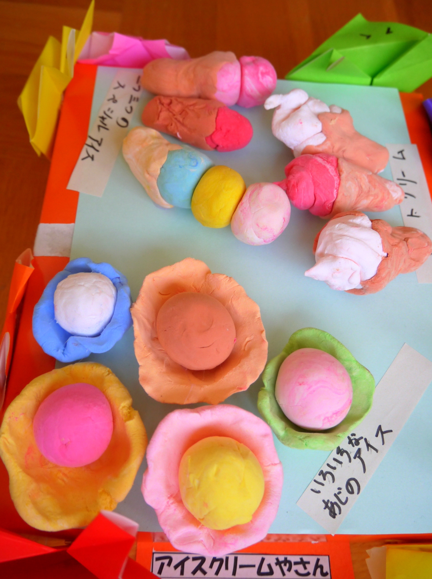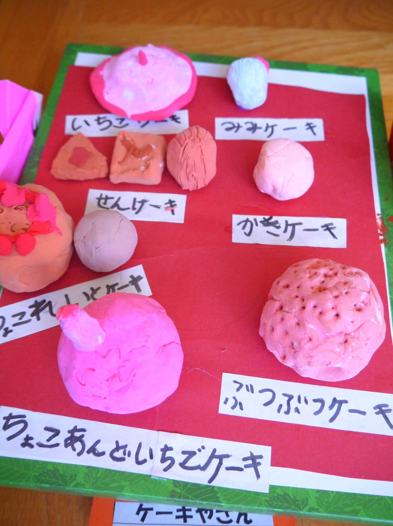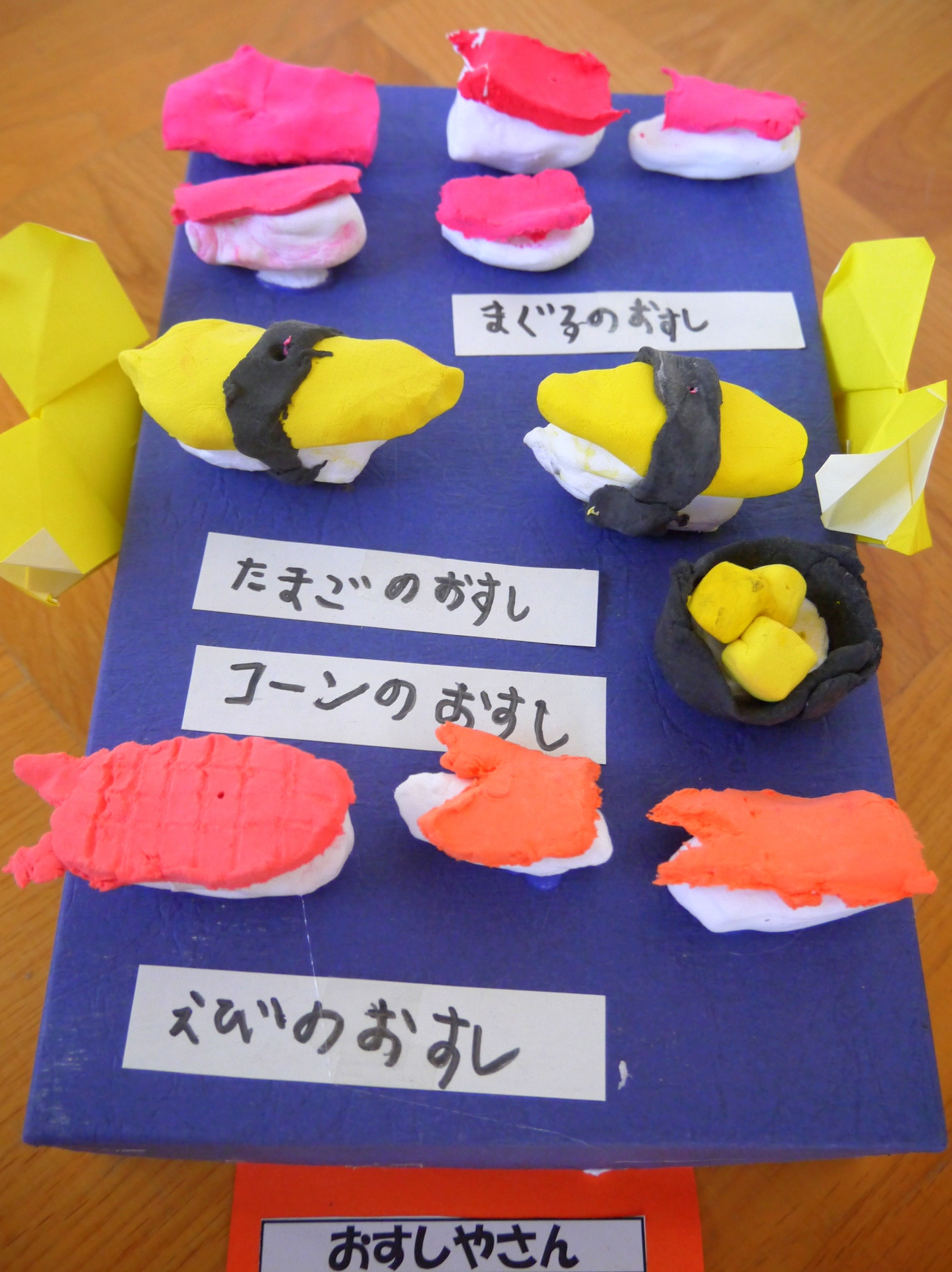 自分たちがお店屋さんになったつもりで、紙粘土で商品を作りました。