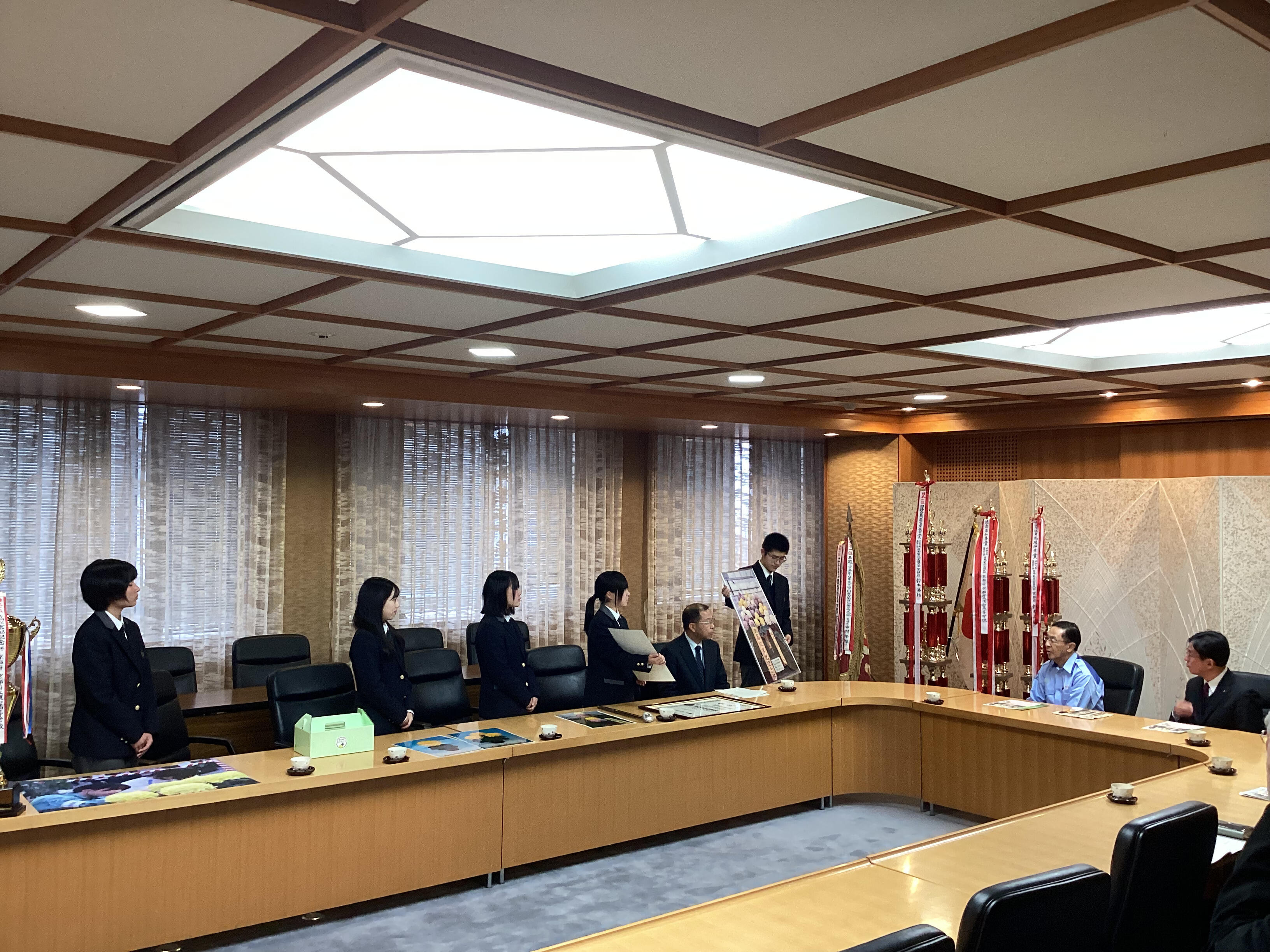 続いて、西脇隆俊知事を表敬訪問して、冬のセットをお渡しし、日本菊花全国大会での快挙について報告させていただきました。前川明範教育長、西脇隆俊知事ともに生徒たちの説明を真剣に聴いてくださり、称賛とねぎらいの言葉をいただきました。