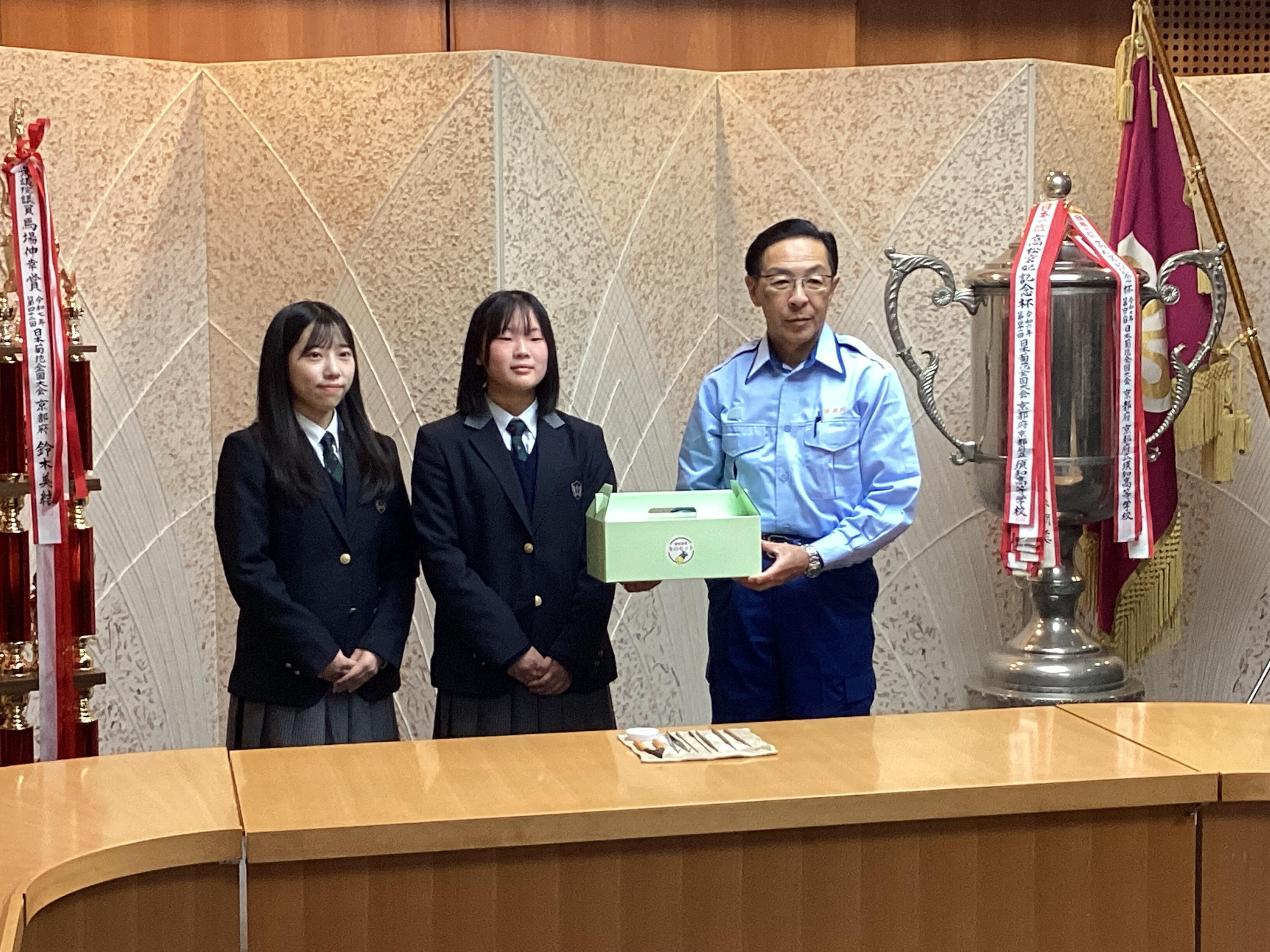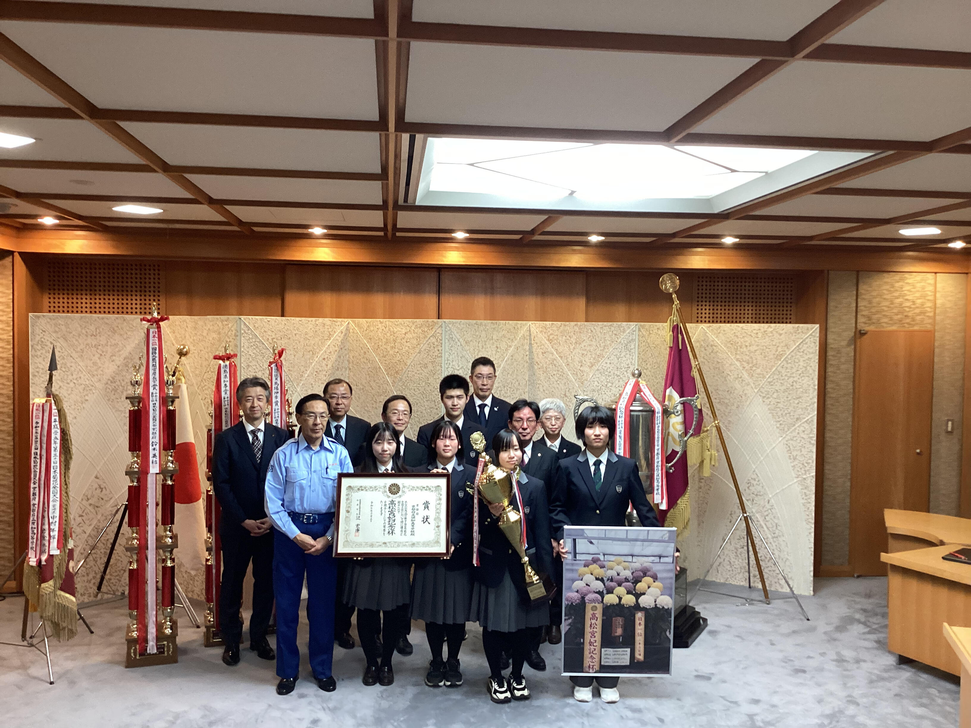 京都府教育庁では、前川明範教育長に須知高校名物の「冬のセット」をお渡しして、日本菊花全国大会で最優秀の高松宮妃記念杯(日本一)に2年連続で選ばれたことと3年生の鈴木美結さんが個人でも達磨の部で最優秀(日本一)の国務大臣内閣官房長官賞を受賞したことをパネル写真などを用いて詳細に報告しました。