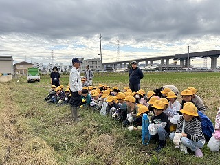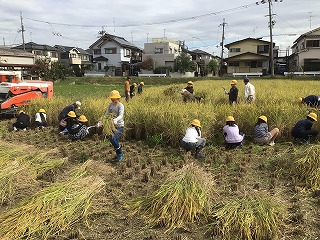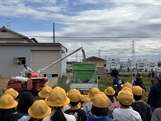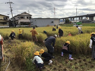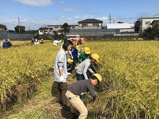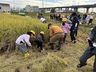 春に田植えした稲が収穫の時期を迎えました。2・5年生は、地域にお住まいの竹村様の田んぼに稲刈りに行きました。はじめに、稲の刈り方を教えてもらいました。そのあと、鎌を持って稲を刈っていきました。みるみるうちに刈り取った稲の山ができあがっていきました。とりわけ5年生は、すべての稲を刈り取るような勢いで取り組んでいたので、お手伝いいただいた地域の方々も「すごい勢いだな」「力強いな」と驚かれていました。秋晴れの下、子どもたちは良い体験ができました。お手伝いいただいた地域の皆様、本当にありがとうございました。