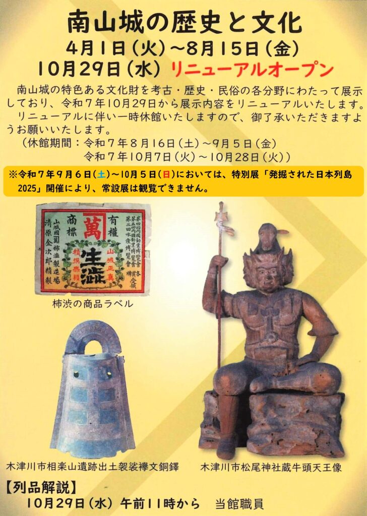 当館では、南山城の特色ある文化財を考古・歴史・民俗の各分野にわたって展示していますが、このたび令和7年10月29日(水)から展示内容をリニューアルいたしました。