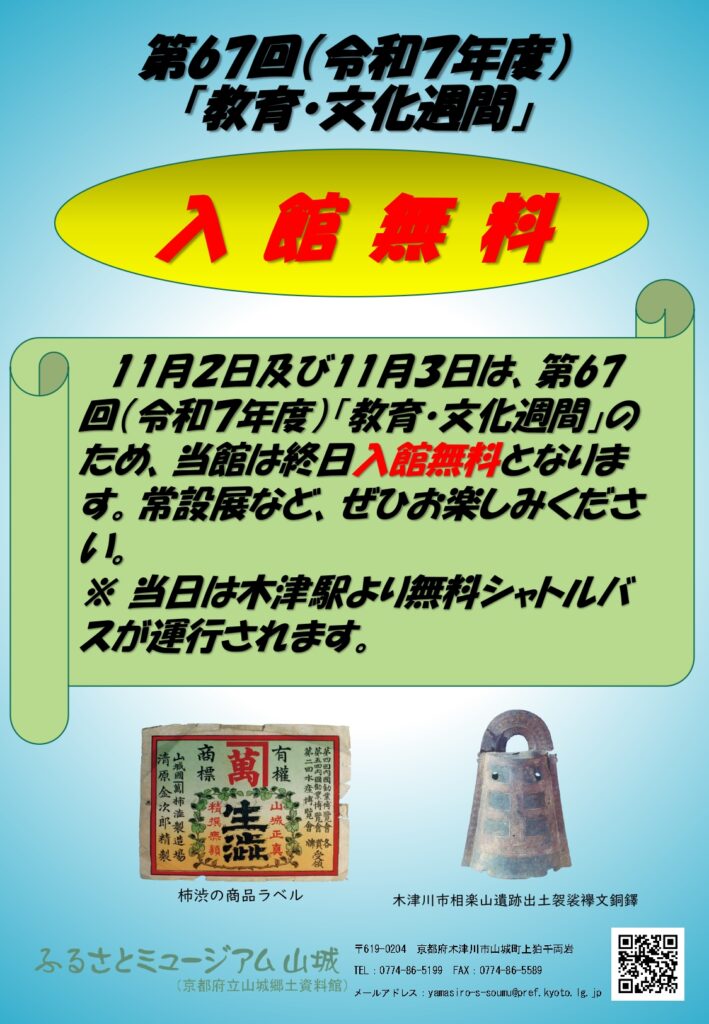 ふるさとミュージアム山城(京都府立山城郷土資料館)において、史跡「恭仁宮跡」活用事業実行委員会主催により、恭仁宮FESTA2025(約1300年前の都の跡で古代ロマンを楽しむイベント)が11月2日(日)・3日(月・祝)に実施され、イベント期間中は無料シャトルバスが当館を経由することから、教育・文化週間をこのイベントに関連付け、当該日を無料開館します。