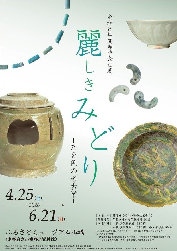 勾玉、緑釉陶器、青磁…。「みどり色」の考古資料は、各時代において貴重な品である場合も多く、人々の「憧れの色」であったと考えられます。本展覧会では、山城地域から出土した縄文時代から近世までの「みどり色」の考古資料を一堂に並べ、その色彩がもつ魅力に迫ります。