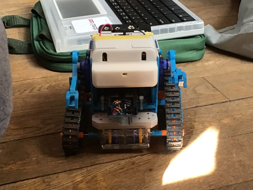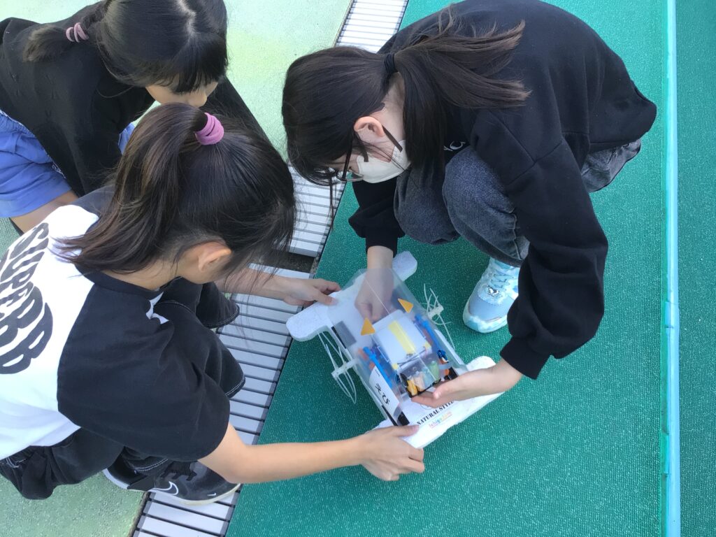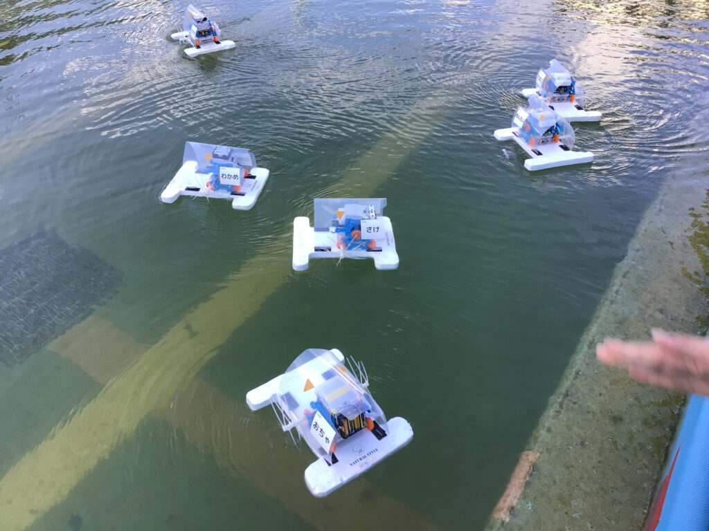まずプログラミングの仕組みを教わり、保存したものをアイガモロボットに取り付けて