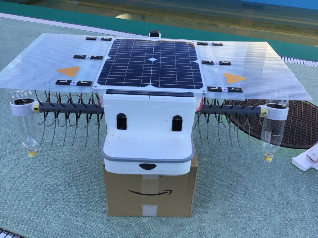 頭にソーラーパネルをのせ、腕にはブラシをつけています。
