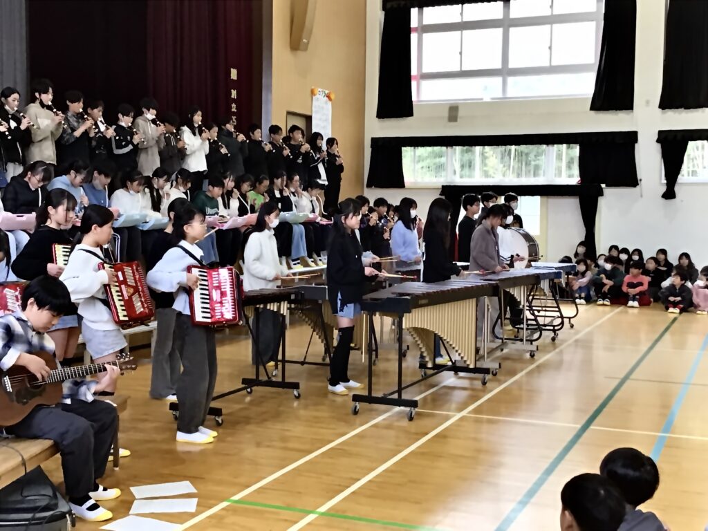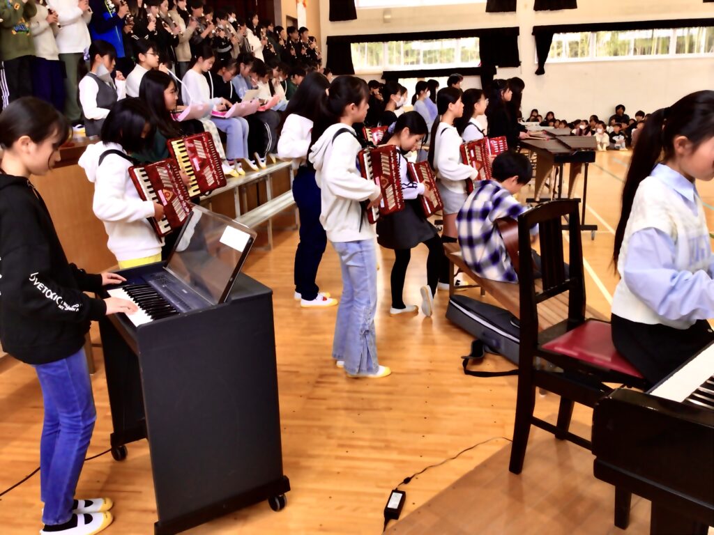 5年生 「手のひらを太陽に」 この会ができたのは、5年生のがんばりがあってこそです。準備、当日の進行、片付けまでやり遂げて立派でした。合奏は大迫力で、会場中が元気になれるような演奏でした。最高学年になることに対する不安もあるけれど、下級生を支えていきたいという覚悟のこもったGIFTでした。