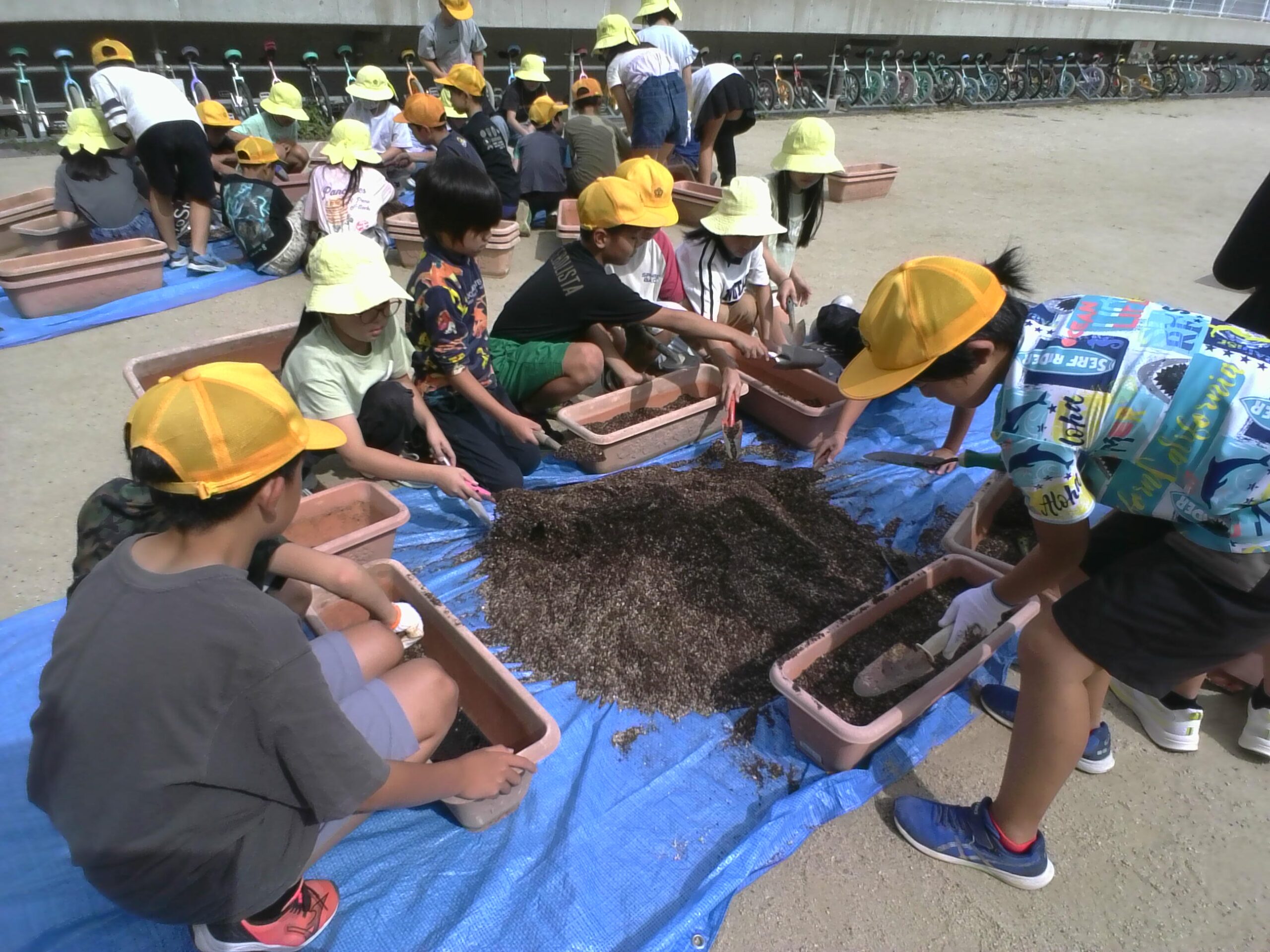 まずは、プランターに土を入れる作業です。スコップを使って、一人ひとりが丁寧に土を運びました。