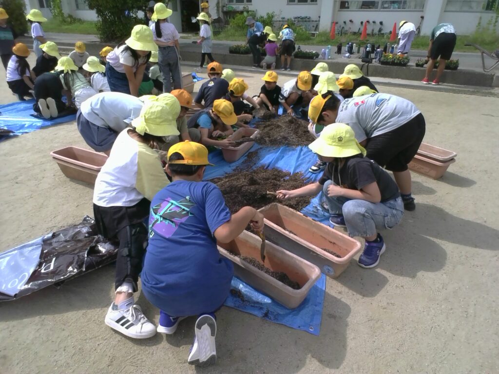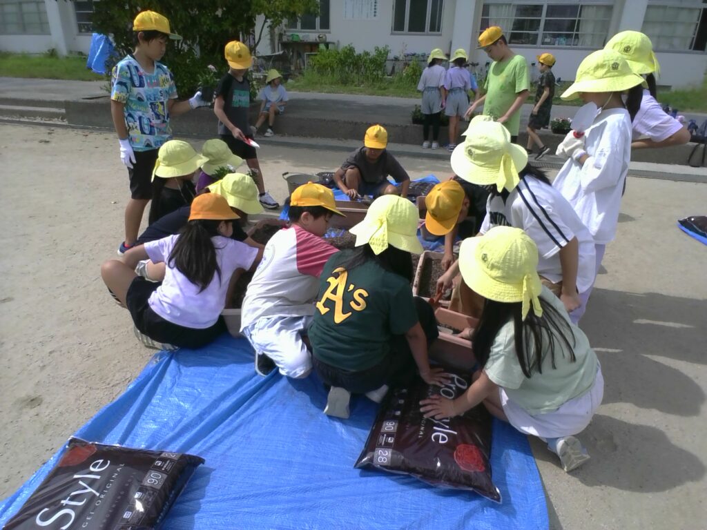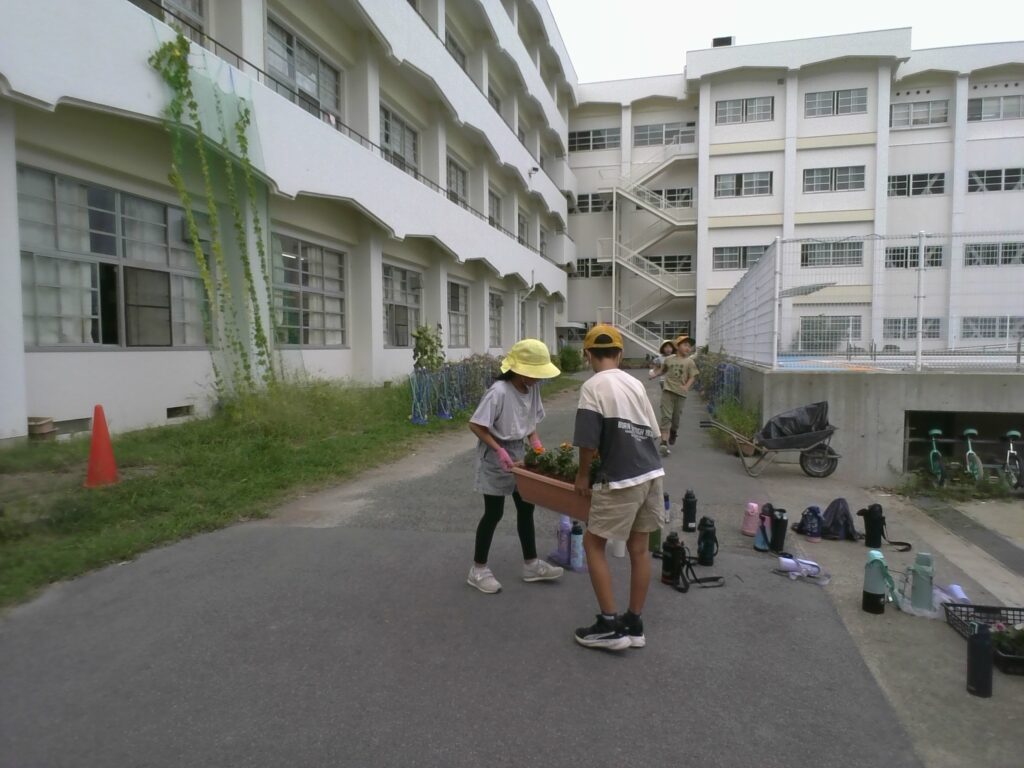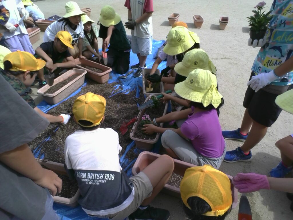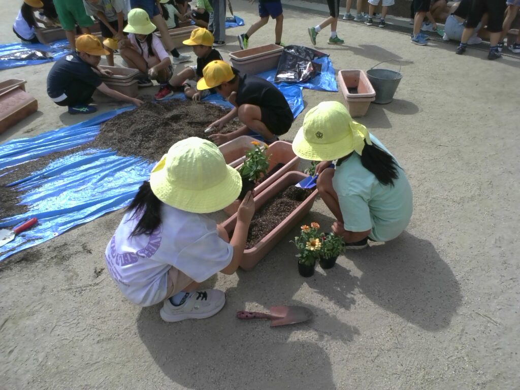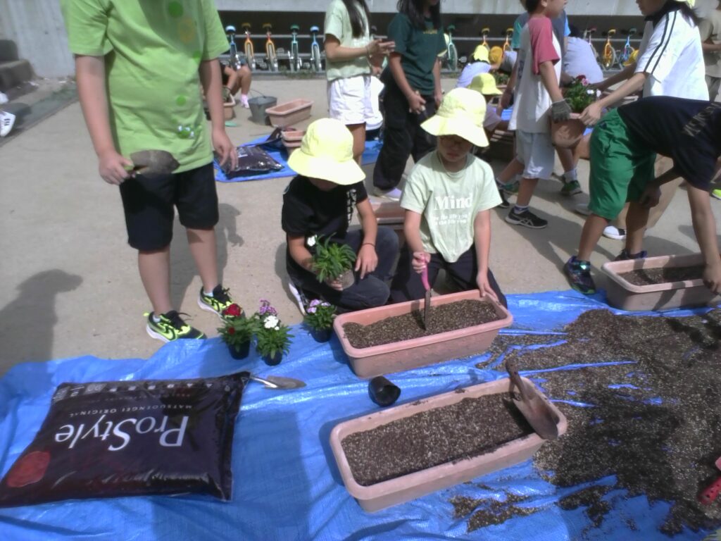 本日、4年生がポットに植えられていた花を、プランターに移し替える活動を行いました。
