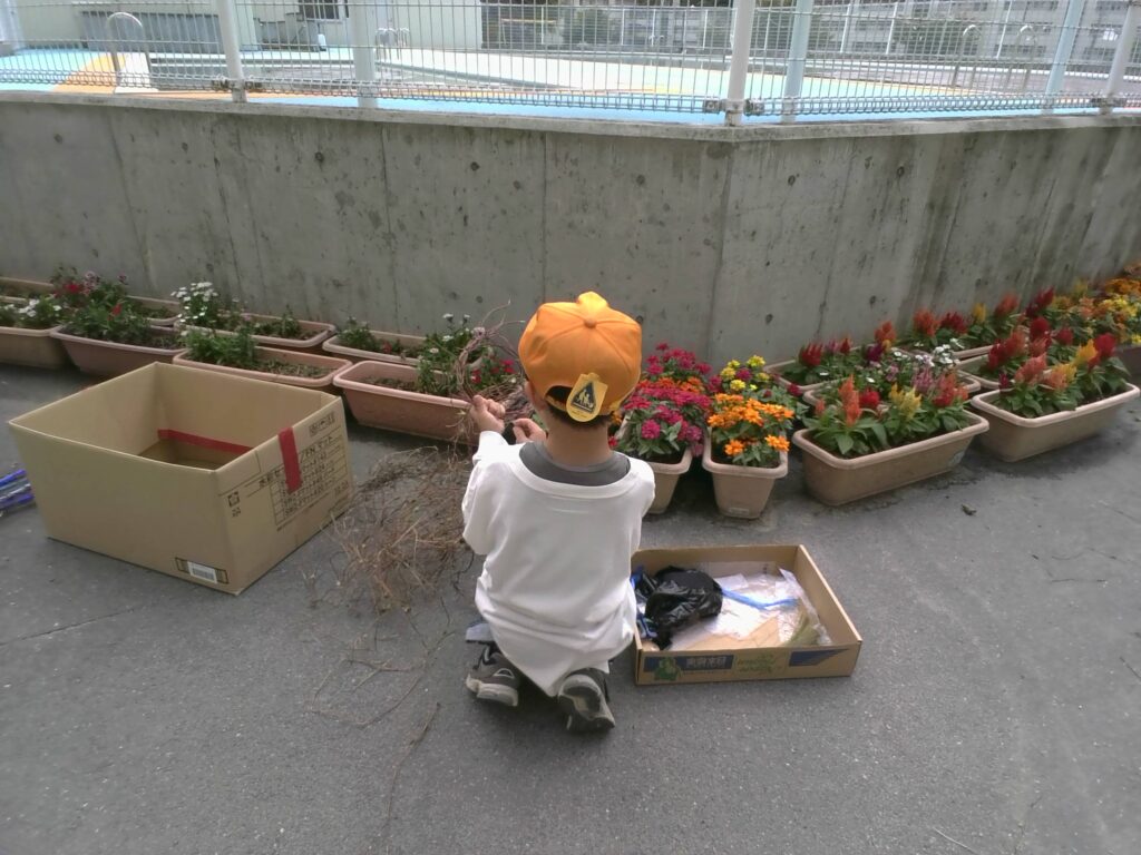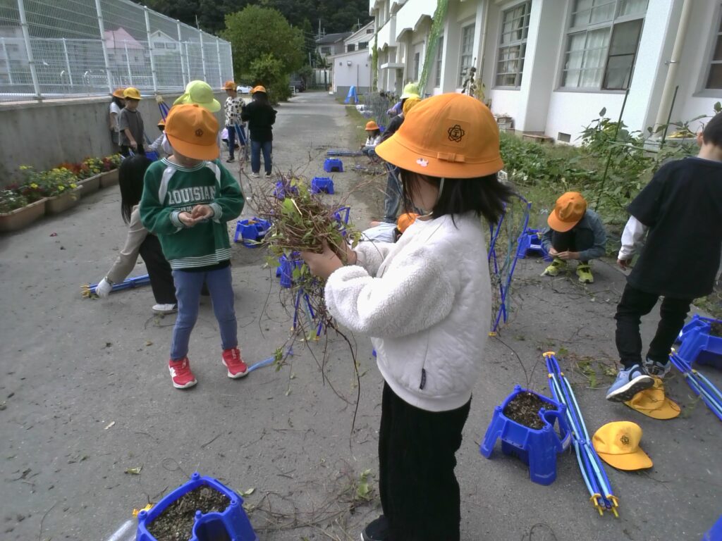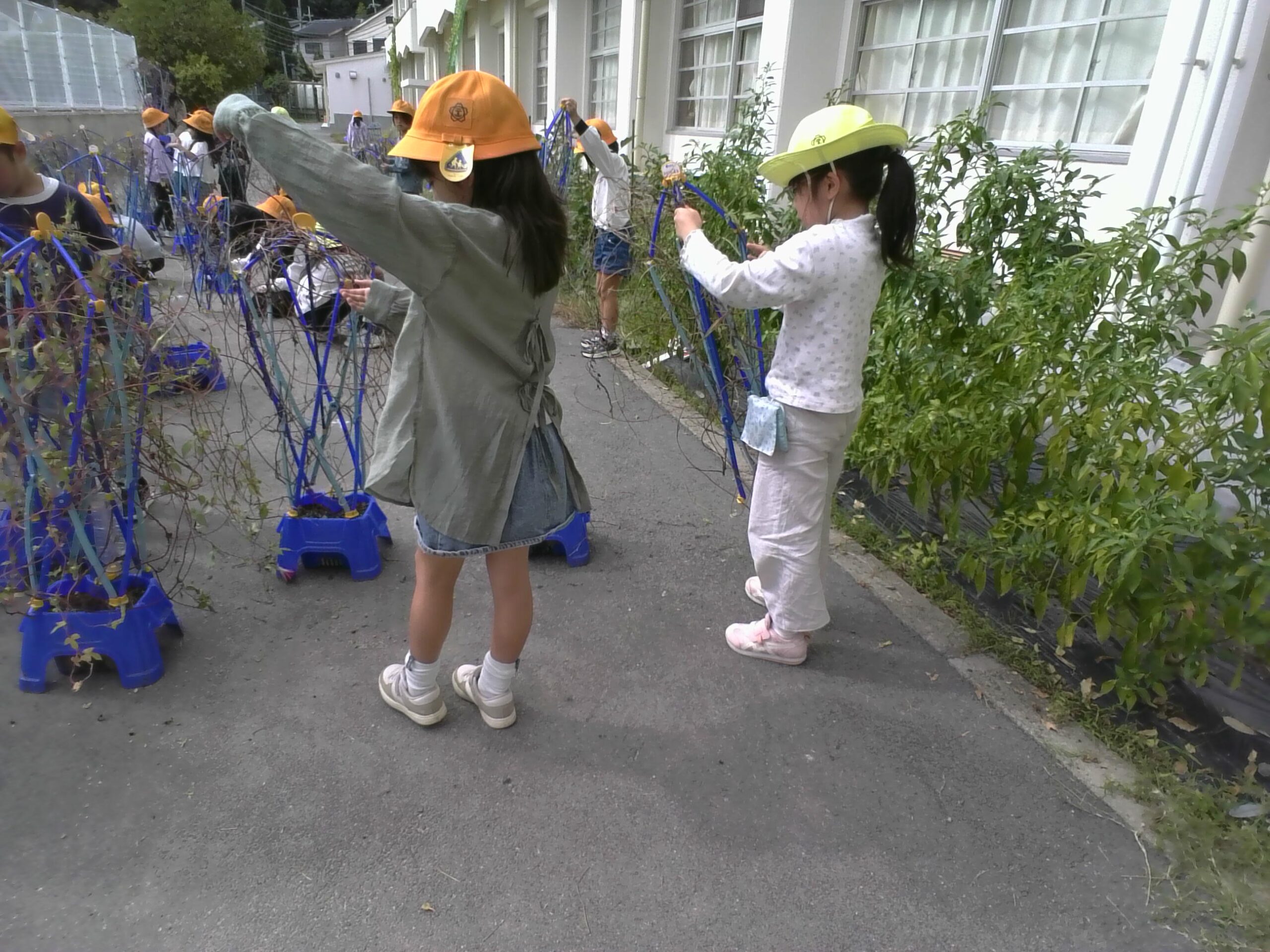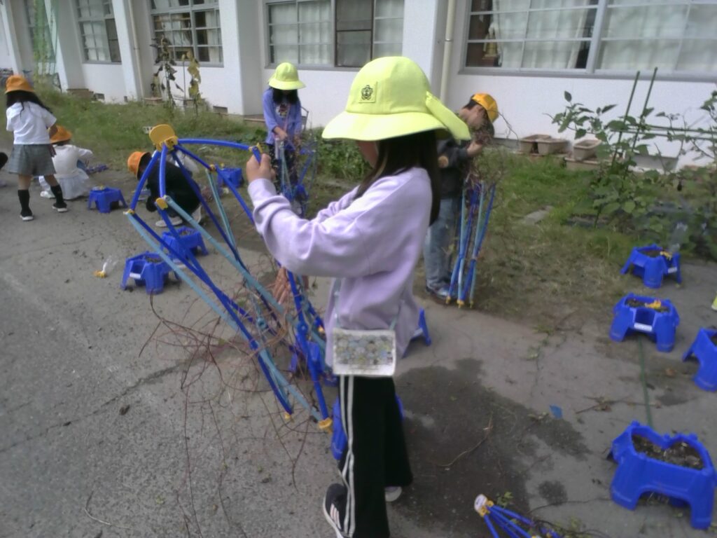 日誌生活科で育てていたアサガオのつるを使って、リース作りを行いました。