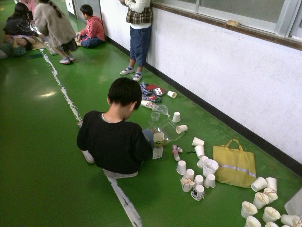 紙コップやストロー、輪ゴムなど、身近な材料を使って、