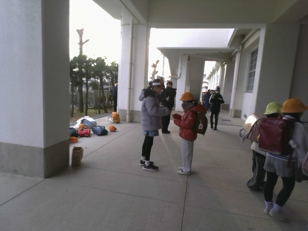 シールをもらった児童は、昇降口に掲示された「鬼ポスター」にペタリ!