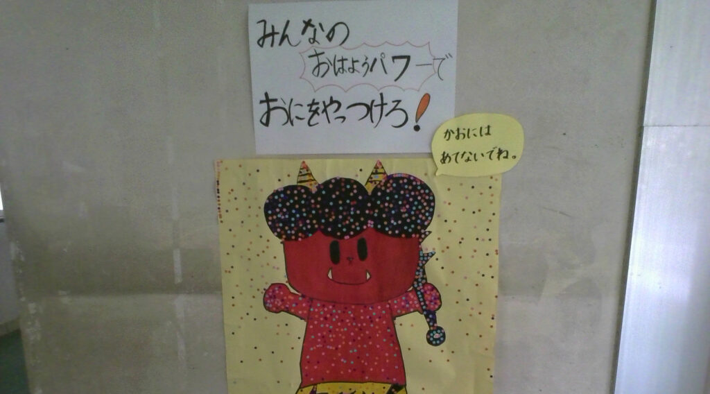 シールが増えるたびに、鬼ポスターもどんどんカラフルに仕上がっていきました。シールの数は、あいさつの数。その積み重ねが一目で分かります。