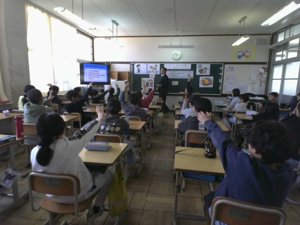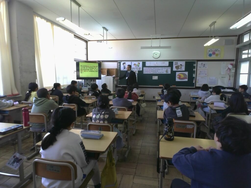授業では、「落とし物の正しい扱い方」や「暴力」、「いじめ」と犯罪との関わりについて教えていただきました。子どもたちにとって身近に起こり得る場面を取り上げながら、どのような行動が大切なのかを分かりやすく説明していただきました。