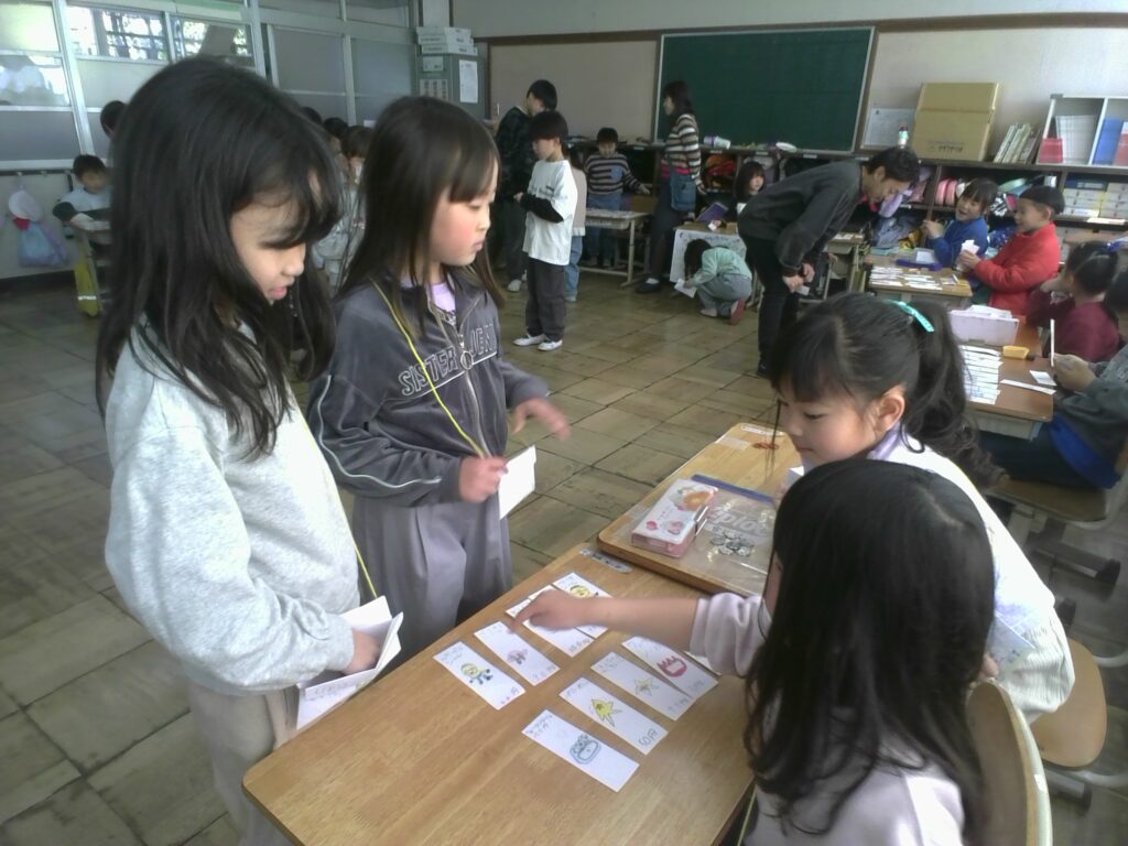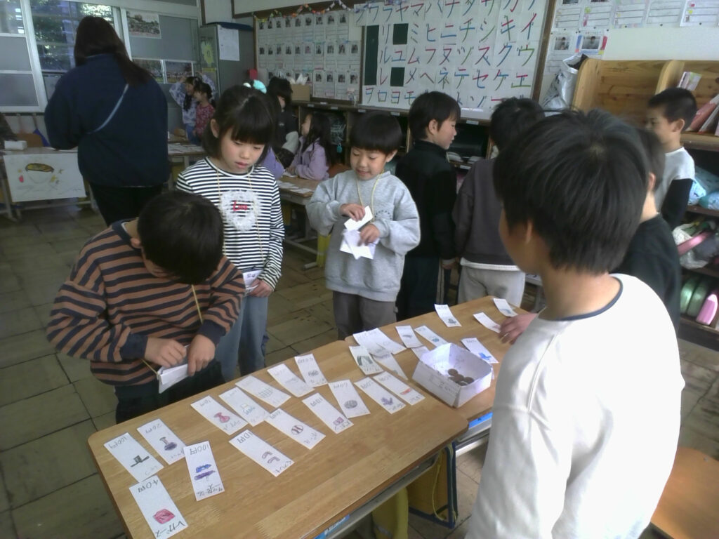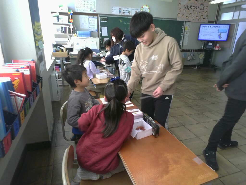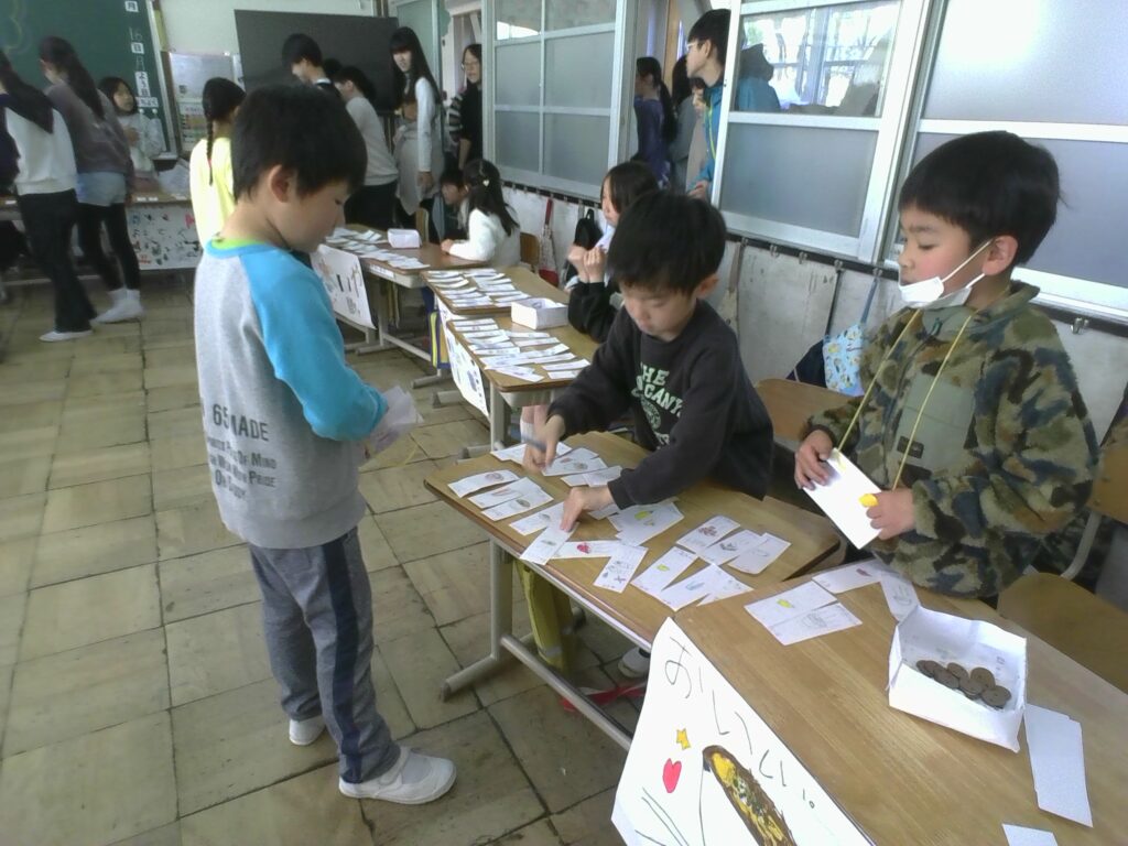 先生たちや6年生もお客さんとしてやってきて、1年生のお店でお買い物を楽しみました。